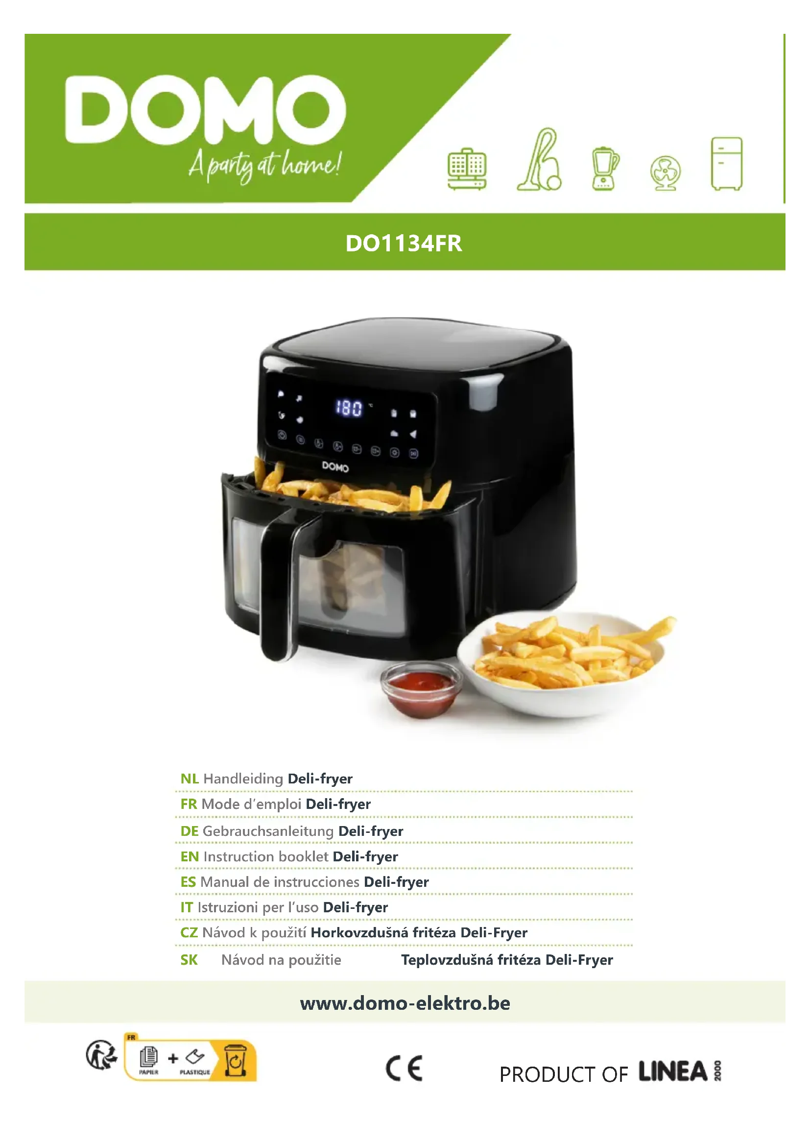 DIRECTIVES Ce symbole sur le produit ou son emballage indique que ce produit ne peut être traité comme déchet ménager. Il doit plutôt être remis au point de ramassage concerné, se chargeant du recyclage du matériel électrique et électronique. En vous assurant que ce produit est éliminé correctement, vous favorisez la prévention des conséquences négatives pour l’environnement et la santé humaine qui, sinon, seraient le résultat d’un traitement inapproprié des déchets de ce produit. Pour obtenir plus de détails sur le recyclage de ce produit, veuillez prendre contact avec le bureau municipal de votre région, votre service d’élimination des déchets ménagers ou le magasin où vous avez acheté le produit. L’emballage est recyclable. Traitez l’emballage écologiquement. Cet appareil est conforme à toutes les exigences européennes en matière de sécurité, de santé et de protection de l’environnement. La déclaration UE de cet appareil peut être demandée à tout moment à l’adresse suivante : info@linea2000.bewww.domo-elektro.be 27