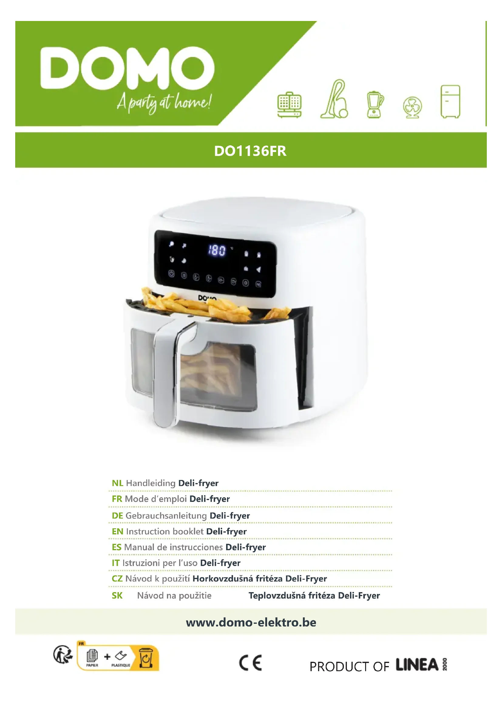 DIRECTIVES Ce symbole sur le produit ou son emballage indique que ce produit ne peut être traité comme déchet ménager. Il doit plutôt être remis au point de ramassage concerné, se chargeant du recyclage du matériel électrique et électronique. En vous assurant que ce produit est éliminé correctement, vous favorisez la prévention des conséquences négatives pour l’environnement et la santé humaine qui, sinon, seraient le résultat d’un traitement inapproprié des déchets de ce produit. Pour obtenir plus de détails sur le recyclage de ce produit, veuillez prendre contact avec le bureau municipal de votre région, votre service d’élimination des déchets ménagers ou le magasin où vous avez acheté le produit. L’emballage est recyclable. Traitez l’emballage écologiquement. Cet appareil est conforme à toutes les exigences européennes en matière de sécurité, de santé et de protection de l’environnement. La déclaration UE de cet appareil peut être demandée à tout moment à l’adresse suivante : info@linea2000.bewww.domo-elektro.be 27