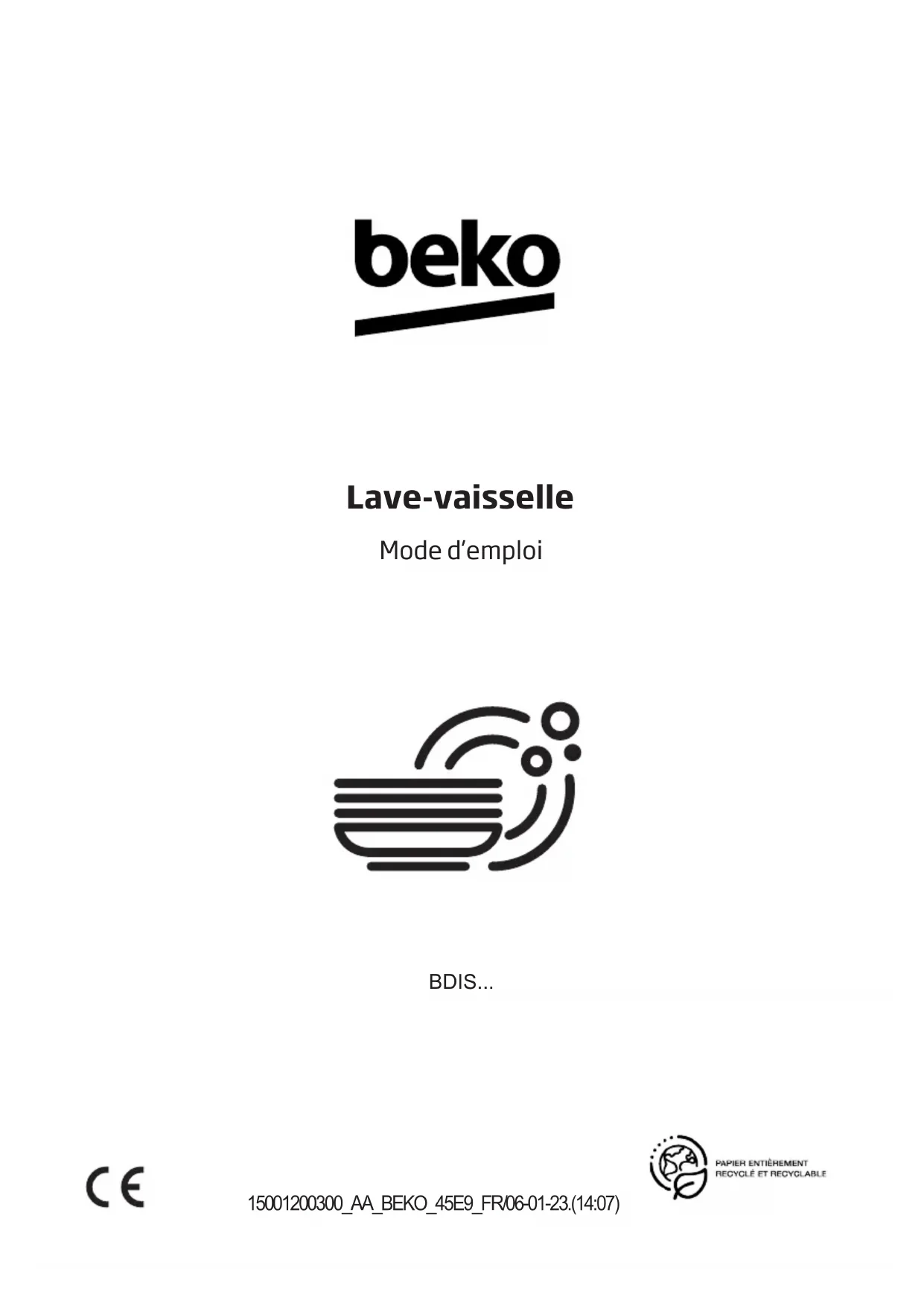 Lave-vaisselle Mode d’emploi 150 0120 0300_AA_BEKO_45E9_FR/ 06-01-23.(14:07) BDIS...Les symboles suivants sont utilisés dans le manuel d’utilisation et sur l’emballage : Danger pouvant entraîner des blessures voire la mort. AVIS Danger pouvant entraîner des dommages au produit ou à son environnement. Informations importantes ou conseils utiles pour l’utilisation Veuillez lire ce manuel d’utilisateur. Cher client, Veuillez lire le présent manuel d’utilisation avant d’utiliser le produit. Merci d’avoir choisi ce produit Beko. Nous espérons que vous obtiendrez les meilleurs résultats avec notre produit fabriqué à partir d’une technologie de pointe et de matériaux de qualité supérieure. C’est pourquoi nous vous recommandons, avant d’utiliser ce produit, de lire attentivement ce manuel et tous les autres documents fournis. Veillez à bien respecter les consignes et les instructions figurant dans le manuel d’utilisation. Ainsi, vous pouvez vous protéger et protéger votre produit contre les dangers potentiels. Veuillez conserver ce manuel d’utilisateur. Si vous confiez le produit à quelqu’un d’autre, n’oubliez pas de lui remettre également le manuel d’utilisation. Ce produit a été fabriqué conformément aux conditions écologiques les plus récentes.TABLE DES MATIÈRES