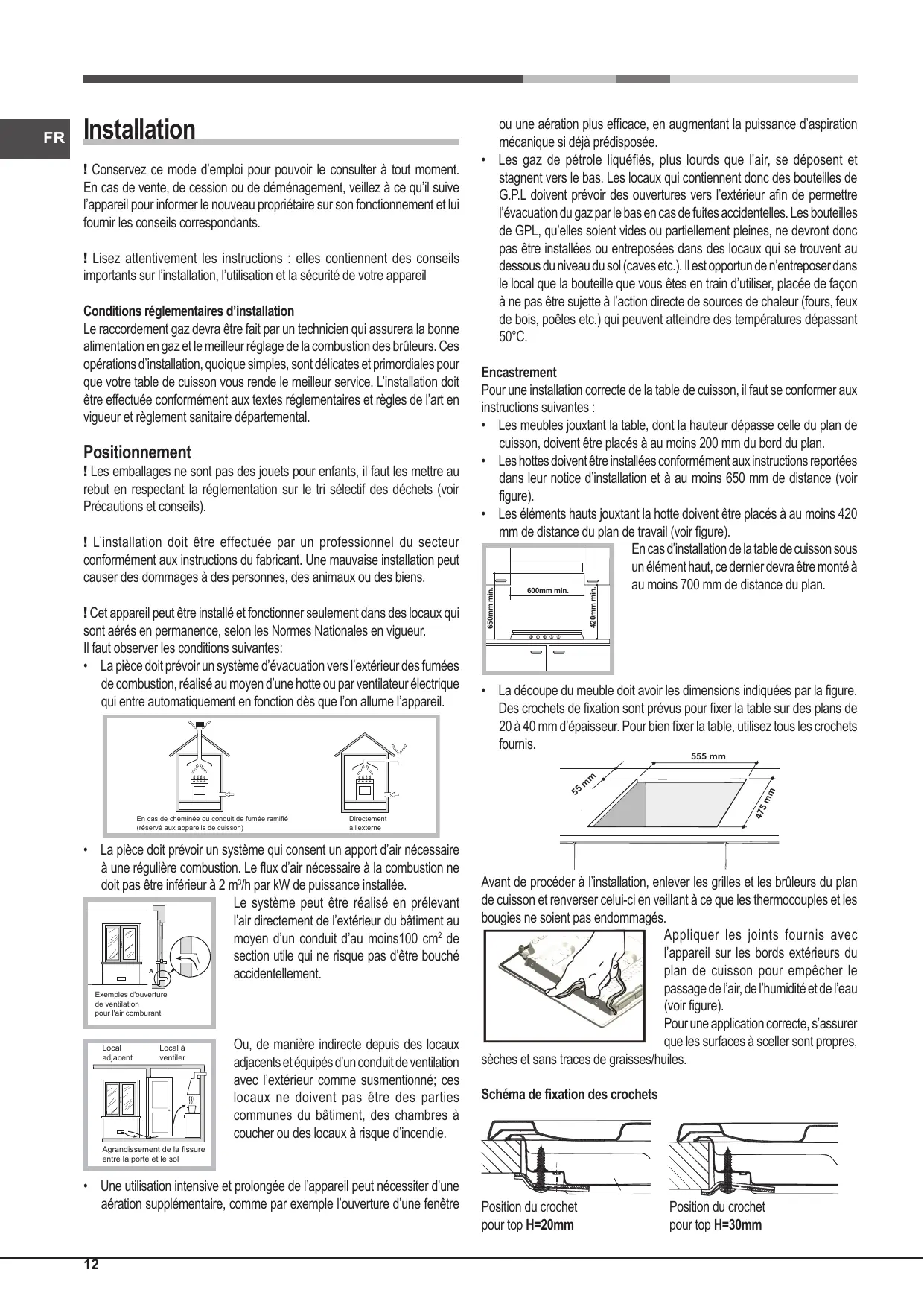 ! Conservez ce mode d’emploi pour pouvoir le consulter à tout moment. En cas de vente, de cession ou de déménagement, veillez à ce qu’il suive l’appareil pour informer le nouveau propriétaire sur son fonctionnement et lui fournir les conseils correspondants. ! Lisez attentivement les instructions : elles contiennent des conseils importants sur l’installation, l’utilisation et la sécurité de votre appareil Conditions réglementaires d’installation Le raccordement gaz devra être fait par un technicien qui assurera la bonne alimentation en gaz et le meilleur réglage de la combustion des brûleurs. Ces opérations d’installation, quoique simples, sont délicates et primordiales pour que votre table de cuisson vous rende le meilleur service. L’installation doit être effectuée conformément aux textes réglementaires et règles de l’art en vigueur et règlement sanitaire départemental. Positionnement ! Les emballages ne sont pas des jouets pour enfants, il faut les mettre au rebut en respectant la réglementation sur le tri sélectif des déchets (voir Précautions et conseils). ! L’installation doit être effectuée par un professionnel du secteur conformément aux instructions du fabricant. Une mauvaise installation peut causer des dommages à des personnes, des animaux ou des biens. ! Cet appareil peut être installé et fonctionner seulement dans des locaux qui sont aérés en permanence, selon les Normes Nationales en vigueur. Il faut observer les conditions suivantes: