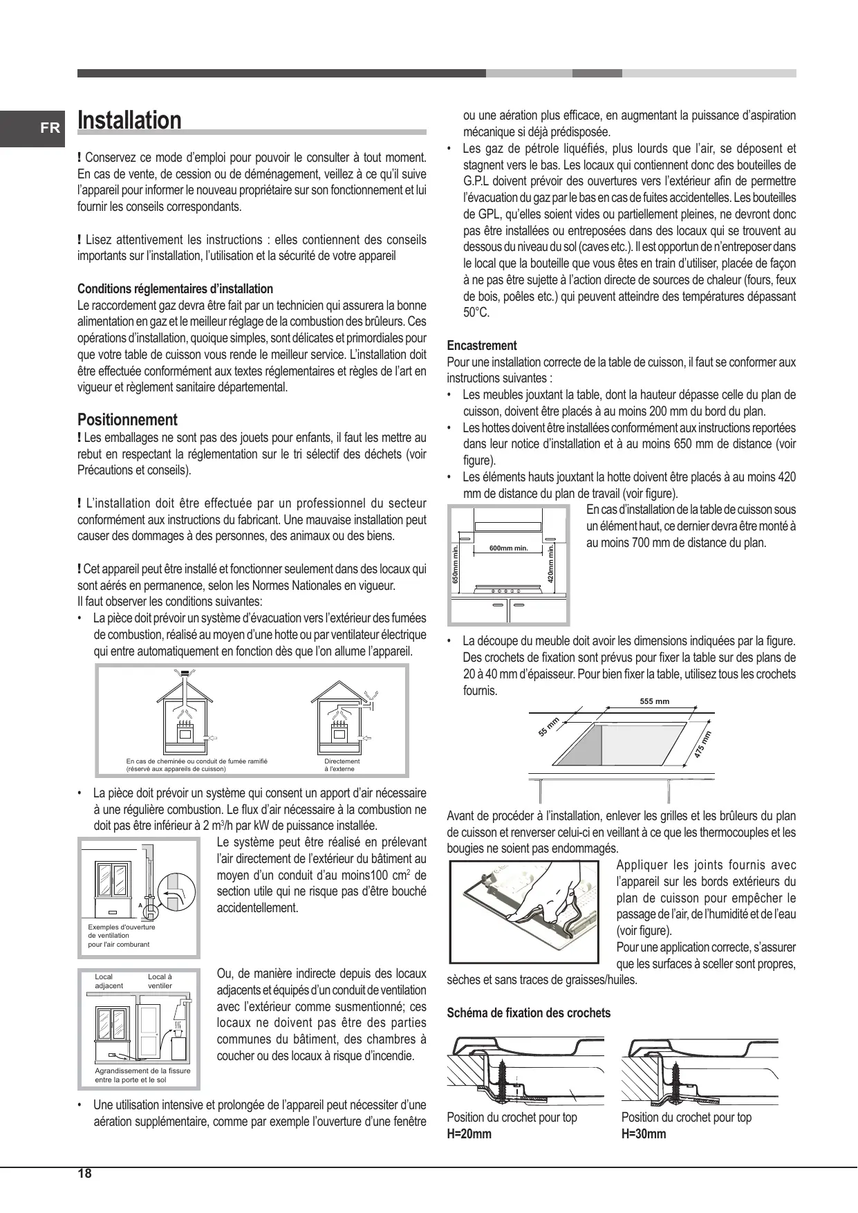 ou une aération plus efficace, en augmentant la puissance d’aspiration mécanique si déjà prédisposée. • Les gaz de pétrole liquéfiés, plus lourds que l’air, se déposent et stagnent vers le bas. Les locaux qui contiennent donc des bouteilles de G.P.L doivent prévoir des ouvertures vers l’extérieur afin de permettre l’évacuation du gaz par le bas en cas de fuites accidentelles. Les bouteilles de GPL, qu’elles soient vides ou partiellement pleines, ne devront donc pas être installées ou entreposées dans des locaux qui se trouvent au dessous du niveau du sol (caves etc.). Il est opportun de n’entreposer dans le local que la bouteille que vous êtes en train d’utiliser, placée de façon à ne pas être sujette à l’action directe de sources de chaleur (fours, feux de bois, poêles etc.) qui peuvent atteindre des températures dépassant 50°C. Encastrement Pour une installation correcte de la table de cuisson, il faut se conformer aux instructions suivantes : • Les meubles jouxtant la table, dont la hauteur dépasse celle du plan de cuisson, doivent être placés à au moins 200 mm du bord du plan. • Les hottes doivent être installées conformément aux instructions reportées dans leur notice d’installation et à au moins 650 mm de distance (voir figure). • Les éléments hauts jouxtant la hotte doivent être placés à au moins 420 mm de distance du plan de travail (voir figure). En cas d’installation de la table de cuisson sous un élément haut, ce dernier devra être monté à au moins 700 mm de distance du plan. 600mm min. 420mm min.