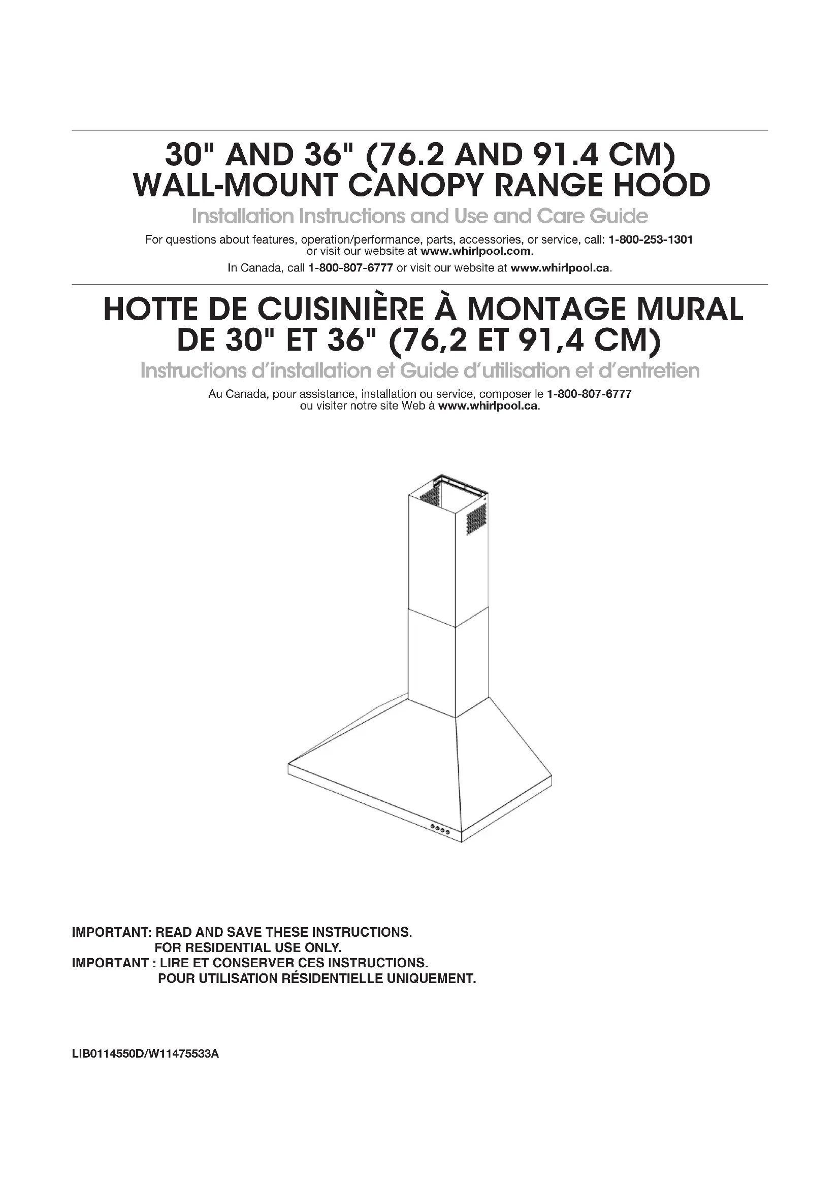 DE30" ET 36" (76,2 ET 91,4 CM) Instructions d’installation et Guide d’utilisation et d’entretien Au Canada, pour assistance, installation ou service, composer le 1-800-807-6777 ou visiter notre site Web à www.whirlpool.ca.