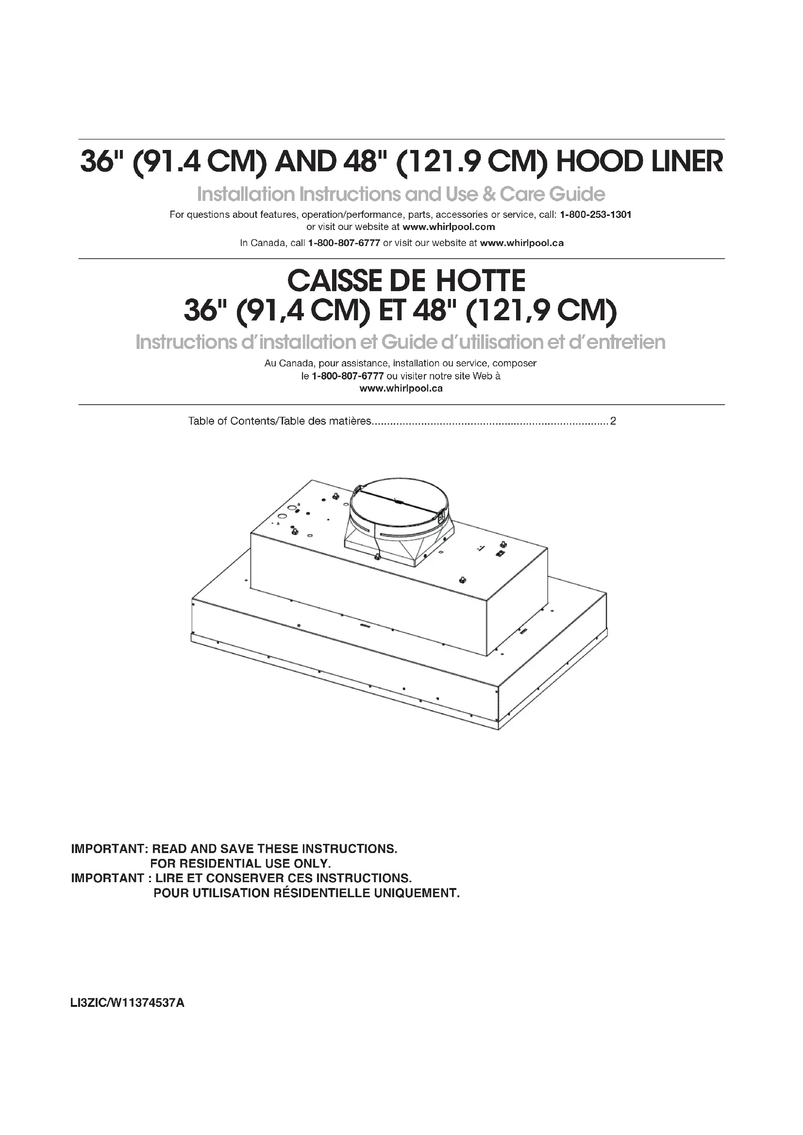 Mississauga, Ontario L5N 0B7 Veuillez inclure dans votre correspondance un numéro de téléphone où l’on peut vous joindre dans la journée. Accessoires Filtre à graisse en acier inoxydable - L'ensemble contient 1 filtre Commander la pièce numéro W10351855 Commander 3 pièces pour le modèle de 36" (91,4 cm) Commander 4 pièces pour le modèle de 48" (121,9 cm) Systèmes de moteur de ventilateur (1 système nécessaire) REMARQUE : Systèmes de ventilation intégrés : le système de ventilation intégré UXB0600DYS de 600 pieds cubes par minute (pi3/min) est destiné à la caisse de hotte de 36" au-dessus d'une table de cuisson dégageant au maximum 65 000 Btu. Utiliser le système de ventilation intégré UXB1200DYS de 1200 pi3/min au-dessus des tables de cuisson dégageant plus de 65 000 Btu ou avec la caisse de hotte de 48". Système de moteur de ventilateur interne de 600 CFM - Commander le modèle numéro UXB0600DYS Système de moteur de ventilateur interne de 1200 CFM - Commander le modèle numéro UXB1200DYS Système de moteur de ventilateur en ligne de 600 CFM - Commander le modèle numéro UXI0600DYS Système de moteur de ventilateur en ligne de 1200 CFM - Commander le modèle numéro UXI1200DYS35LI3ZIC/W1137 4537A 06/19 Printed in Mexico Imprimé au Mexique ©2019 All rights reserved. Used under license in Canada. Tous droits réservés. Utilisé sous licence au Canada.