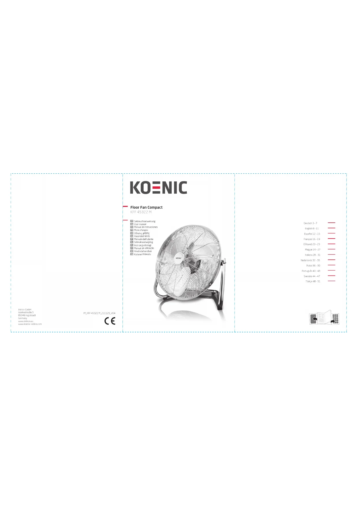 - Important! Vérifiez que le produit est en parfait état de marche avant de l’utiliser. Le produit ne doit pas être utilisé s’il présente des signes d’endommagement ou s’il est suspecté d’être défectueux.18 Français Mise au rebut Le symbole de la poubelle sur roues barrée d’une croix aché sur le produit ou l’emballage indique que cet appareil ne doit pas être jeté avec les ordures ménagères, il doit être collecté séparément. Vous pouvez jeter votre appareil gratuitement au point de collecte et de recyclage le plus proche. Vous pouvez obtenir l’adresse auprès de votre mairie ou de l’administration locale responsable. Vous pouvez également renvoyer gratuitement vos petits déchets d’équipements électriques et électroniques (DEEE) dont les dimensions extérieures sont inférieures à 25cm à un distributeur disposant d’une surface de vente d’équipements électriques et électroniques (EEE) d’au moins 400m2 ou à un magasin d’alimentation qui vend des EEE plusieurs fois par an avec une surface de vente totale de 800m2. Les DEEE plus grands peuvent être renvoyés gratuitement au revendeur respectif lors de l’achat d’un nouveau produit du même type. En ce qui concerne les modalités de collecte des DEEE, en cas d’expédition du produit récemment acheté, veuillez contacter votre revendeur. Veuillez retirer les batteries ou les accumulateurs ainsi que toute lampe amovible si possible avant la mise au rebut de l’appareil. Notez que vous êtes responsable de la suppression des données personnelles sur l’appareil à éliminer. Contenu 1 x Ventilateur métallique 1 x Guide d’utilisateur Données techniques Tension nominale : 220 - 240 V~, 50Hz Puissance nominale : 125 W Classe de protection : I Diamètre du ventilateur : environ 54 x 25 x 53 cm Poids : environ 4,6 kg Félicitations! Merci d’avoir acheté un produit KOENIC. Veuillez lire soigneusement ce manuel et le conserver pour une consultation future. Utilisation recommandée Le produit n’est conçu que pour faire circuler l’air dans une pièce. N’utilisez l’appareil qu’en respectant ces consignes. Toute autre utilisation peut endommager le produit ou causer des blessures. La société Imtron GmbH décline toute responsabilité pour des dommages au produit, aux biens ou pour des blessures dûs à une négligence ou une manipulation inadéquate du produit, qui ne serait pas conforme aux instructions du fabricant. Avant de l’utiliser pour la premiere fois Retirez soigneusement le produit et les accessoires de leur emballage d’origine. Il est conseillé de conserver l’emballage d’origine pour le rangement. Si vous souhaitez disposer de l’emballage d’origine, veuillez respecter les recommandations légales en vigueur. Si vous avez des questions concernant le rebut approprié, contactez le service de déchetterie local. Vérifiez que le contenu est complet et qu’il n’est pas endommagé. Si le contenu livré est incomplet ou endommagé, contactez immédiatement votre revendeur. Après avoir déballé, veuillez consulter la section Nettoyage et entretien.19 Français Attention L’appareil ne doit jamais être mis en marche sans le pied ou en position horizontale. Fonctionnement Fig.