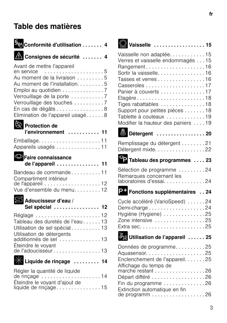 Cycle accéléré (VarioSpeed) Demi-charge . . . . . . . . . . . . . Hygiène (Hygiene) . . . . . . . . Zone intensive . . . . . . . . . . . Extra sec. . . . . . . . . . . . . . . . Sel spécial . . . . . . . . . . . . . . . . 12 Réglage . . . . . . . . . . . . . . . . . Tableau des duretés de l’eau . Utilisation de sel spécial . . . . . Utilisation de détergents additionnés de sel . . . . . . . . . Éteindre le voyant de l’adoucisseur . . . . . . . . . . . - Vaisselle