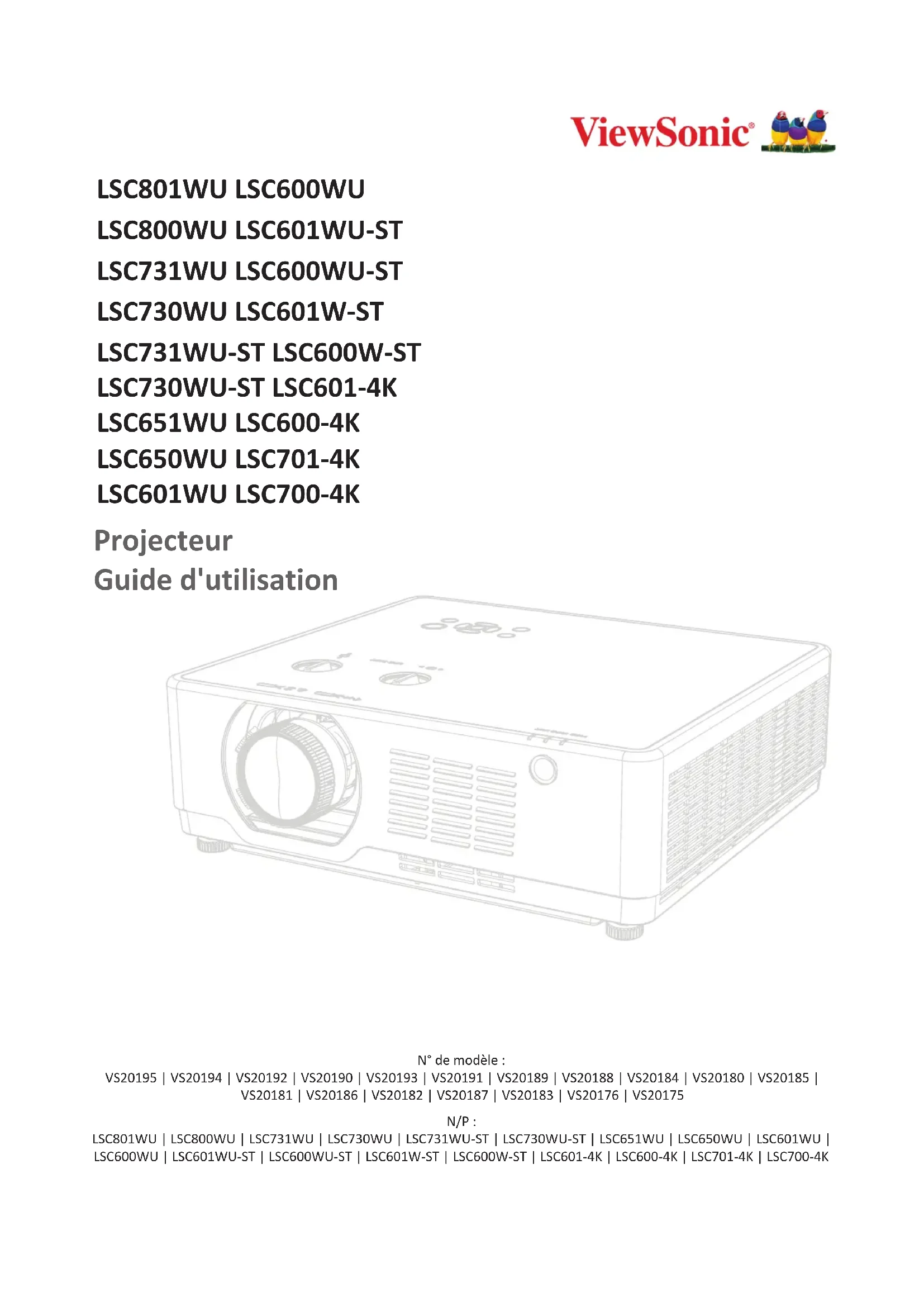 Projecteur Guide d'utilisation N° de modèle : VS20195 | VS20194 | VS20192 | VS20190 | VS20193 | VS20191 | VS20189 | VS20188 | VS20184 | VS20180 | VS20185 | VS20181 | VS20186 | VS20182 | VS20187 | VS20183 | VS20176 | VS20175 N/P : LSC801WU | LSC800WU | LSC731WU | LSC730WU | LSC731WU-ST | LSC730WU-ST | LSC651WU | LSC650WU | LSC601WU | LSC600WU | LSC601WU-ST | LSC600WU-ST | LSC601W-ST | LSC600W-ST | LSC601-4K | LSC600-4K | LSC701-4K | LSC700-4K2 Merci d’avoir choisi ViewSonic® En tant que leader mondial de solutions visuelles, ViewSonic® se consacre à dépasser les attentes du monde en matière d’évolution technologique, d’innovation et de simplicité. Chez ViewSonic®, nous pensons que nos produits peuvent avoir un impact positif dans le monde et nous sommes convaincus que le produit ViewSonic® que vous avez choisi vous servira correctement. Une fois de plus, merci d’avoir choisi ViewSonic® !3 Précauons relaves à la sécurité Veuillez lire les Précauons de sécurité suivantes avant de commencer à uliser le projecteur.