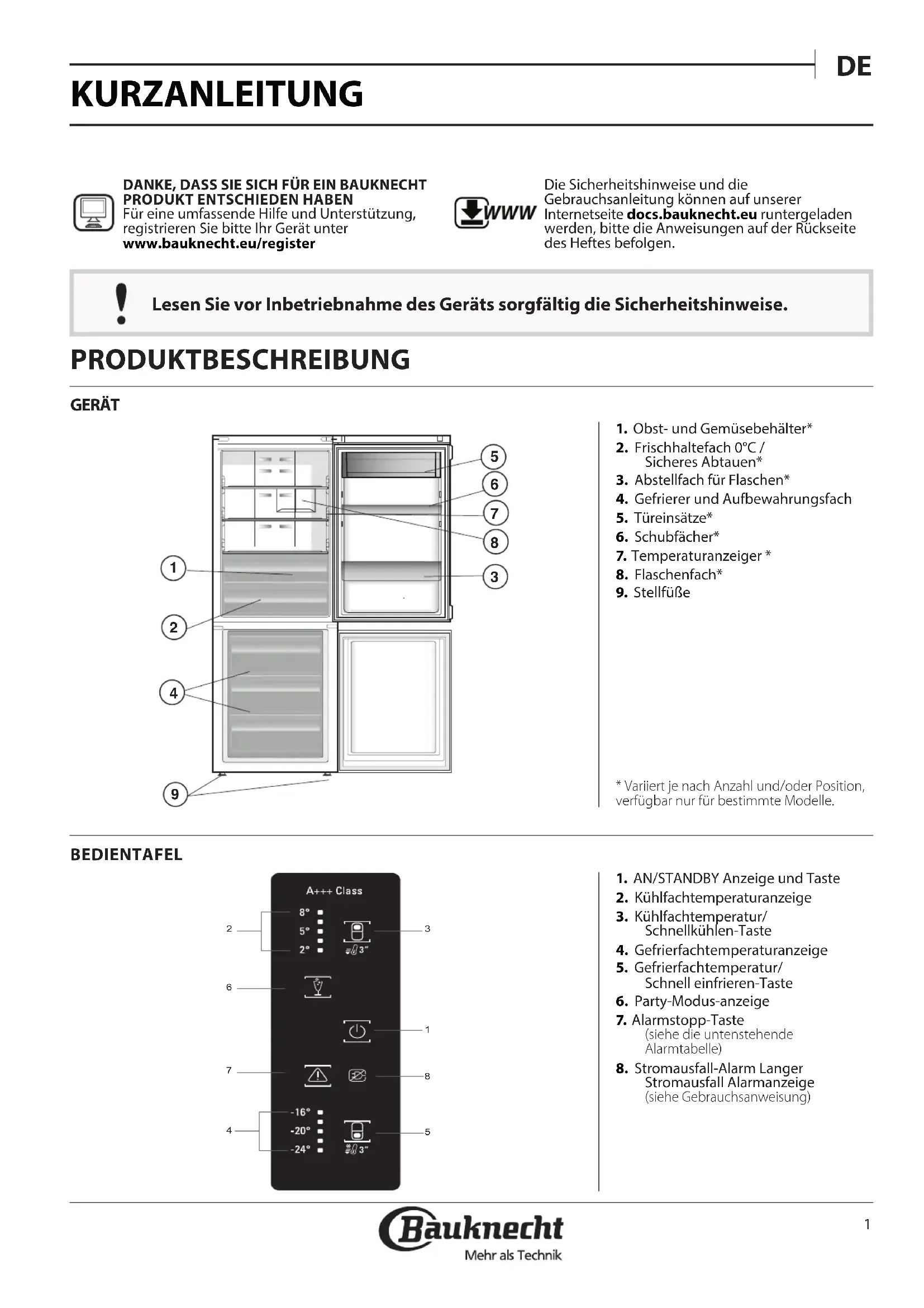 GUIDE D'UTILISATION QUOTIDIENNE Avant d'utiliser l'appareil, lisez attentivement les Consignes de sécurité. MERCI D'AVOIR CHOISI UN PRODUIT BAUKNECHTAn de recevoir un service et un support complet, merci d'enregistrer votre appareil sur www. bauknecht. eu/register WWW Vous pouvez télécharger les Consignes de sécurité et le Guide d'utilisation et d'entretien en visitant notre site Web docs. bauknecht. eu et en suivant les consignes au dos de ce livret. APPAREIL