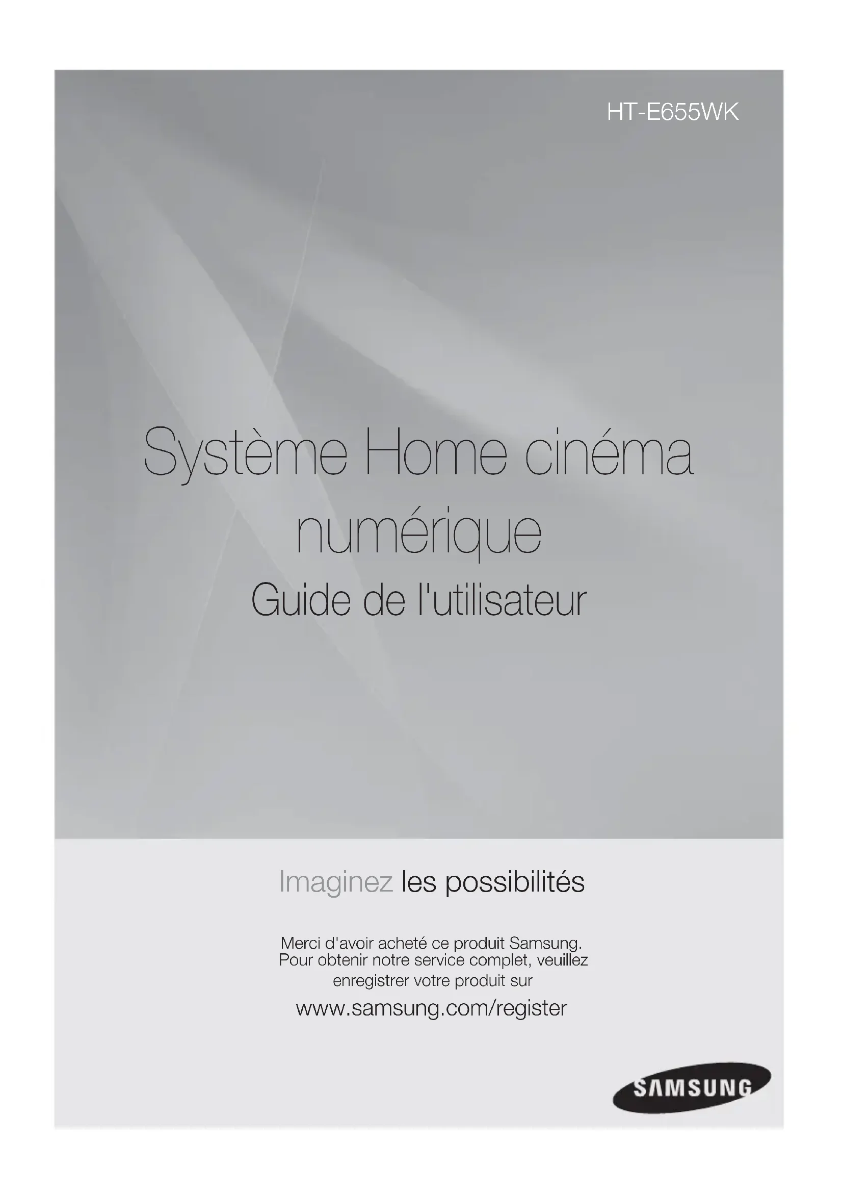 Système Home cinéma numérique Guide de l'utilisateur Imaginez les possibilités Merci d'avoir acheté ce produit Samsung.Pour obtenir notre service complet, veuillez enregistrer votre produit sur www.samsung.com/register HT-E655WK HT-E655WK-NO-EUR-FRA.indd Sec1:1HT-E655WK-NO-EUR-FRA.indd Sec1:1 2012-8-13 14:01:182012-8-13 14:01:182 French Consignes de sécurité Avertissements de sécurité POUR RÉDUIRE LES RISQUES D’ÉLECTROCUTION, NE RETIREZ JAMAIS LE CAPOT (NI L’ARRIÈRE).LES PIÈCES DE CE PRODUIT NE SONT PAS RÉPARABLES PAR L’UTILISATEUR. VEUILLEZ CONTACTER UN TECHNICIEN QUALIFIÉ POUR TOUTE RÉPARATION. ATTENTION RISQUE D’ÉLECTROCUTIONNE PAS OUVRIRCe symbole indique la présence d’une tension dangereuse dans l’appareil, présentant un risque d’électrocution ou de blessures.ATTENTION : AFIN D’ÉVITER TOUT RISQUE D’ÉLECTROCUTION, LA BROCHE LA PLUS LARGE DE LA FICHE DOIT ÊTRE TOTALEMENT INSÉRÉE DANS LE TROU PLUS LARGE.Ce symbole indique les directives importantes qui accompagnent le produit. AVERTISSEMENT