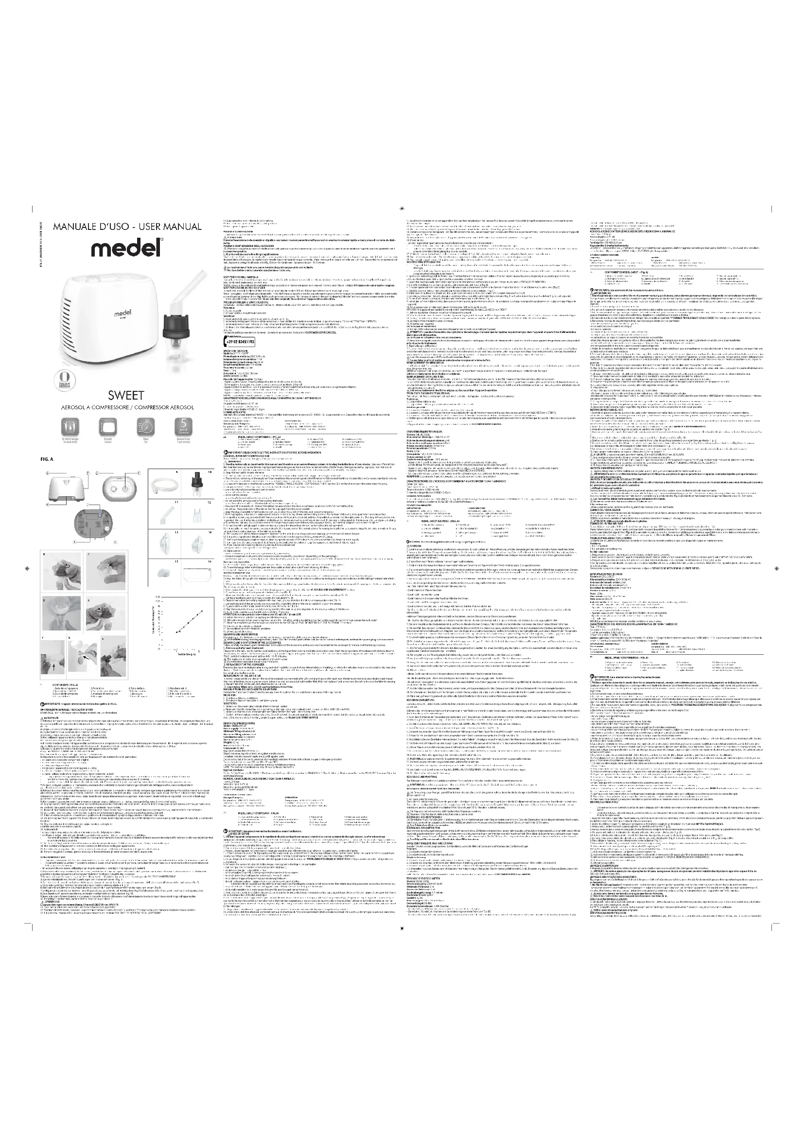 - ne pas tirer le câble d’alimentation ou l’appareil pour débrancher la che de la prise de courant ;• câble d’alimentation doit rester accessible une fois que l’appareil est en fonction. 7. Avant de brancher la che d’alimentation, s’assurer que les données électriques indiquées sur la plaque signalétique située sur le fond l’appareil correspondent bien à celles du réseau de distribution électrique. 8. Si la che fournie avec l’appareil n’est pas compatible avec la prise du réseau électrique, s’adresser à un personnel qualié pour la remplacer par une che d’un type approprié. De manière générale, il est déconseillé d’utiliser des adaptateurs, simples ou multiples, et/ou des rallonges. Si leur utilisation est indispensable, utiliser les types conformes aux normes de sécurité, en prenant garde de ne pas dépasser les limites maximum d’alimentation autorisées, qui sont indiquées sur les adaptateurs et sur les rallonges. 9. Ne pas laisser inutilement l’appareil branché : débrancher la che d’alimentation de l’appareil lorsqu’il n’est pas utilisé. 10. L’installation doit être eectuée conformément aux instructions du fabricant. Le fabricant décline toute responsabilité quant aux dommages causés aux personnes, aux animaux ou aux choses dérivant d’une installation incorrecte COMPONENTI - (FIG. A) 1. Sede del compressore 2. Interruttore ON/OFF 3. Cavo di alimentazione 4. Uscita dell’aria5. Porta ltro 6. Supporto per nebulizzatore7. Aperture di ventilazione 8. Maniglia 9. Tubo dell’aria10. Nebulizzatore11. Boccaglio 12. Forcella nasale13. Maschera adulti14. Maschera pediatrica15. Filtri aria di ricambio16. Borsina porta - accessori IMPORTANTE: Leggere attentamente le istruzioni prima dell’uso.INFORMAZIONI GENERALI / INDICAZIONI D’USOMedel SWEET è un sistema per aerosolterapia indicato per uso domiciliare. AVVERTENZE 1. Utilizzare l’apparecchio solo come descritto nel presente manuale e quindi come sistema per aerosolterapia, seguendo le indicazioni del proprio medico. Ogni uso diverso da quello cui l’apparecchio è destinato è da considerarsi improprio e quindi pericoloso; il costruttore non può essere considerato responsabile per danni causati da uso improprio, erroneo e/od irragionevole o se l’apparecchio è utilizzato in impianti elettrici non conformi alle vigenti norme di sicurezza.2. Conservare questo manuale per ogni ulteriore consultazione.3. Non utilizzare l’apparecchio in presenza di miscele anestetiche inammabili con ossigeno o protossido di azoto. 4. Il corretto funzionamento dell’apparecchio potrebbe essere compromesso da interferenze elettromagnetiche eccedenti i limiti espressi nelle norme europee in vigore. Nel caso l’apparecchio dovesse interferire con altri dispositivi elettrici, spostarlo e connetterlo ad una diversa presa elettrica. 5. In caso di guasto e/o cattivo funzionamento dell’apparecchio, consultare il capitolo “POSSIBILI PROBLEMI E LORO SOLUZIONE”. Non manomettere o aprire l’alloggiamento del compressore.6. Rispettare le norme di sicurezza indicate per le apparecchiature elettriche ed in particolare:• utilizzare solo accessori e componenti originali;• non immergere mai l’apparecchio in acqua;• non bagnare l’apparecchio;• non toccare l’apparecchio con mani bagnate o umide;• non lasciare l’apparecchio esposto agli agenti atmosferici;• durante l’utilizzo posizionare l’apparecchio su ripiani orizzontali e stabili;
