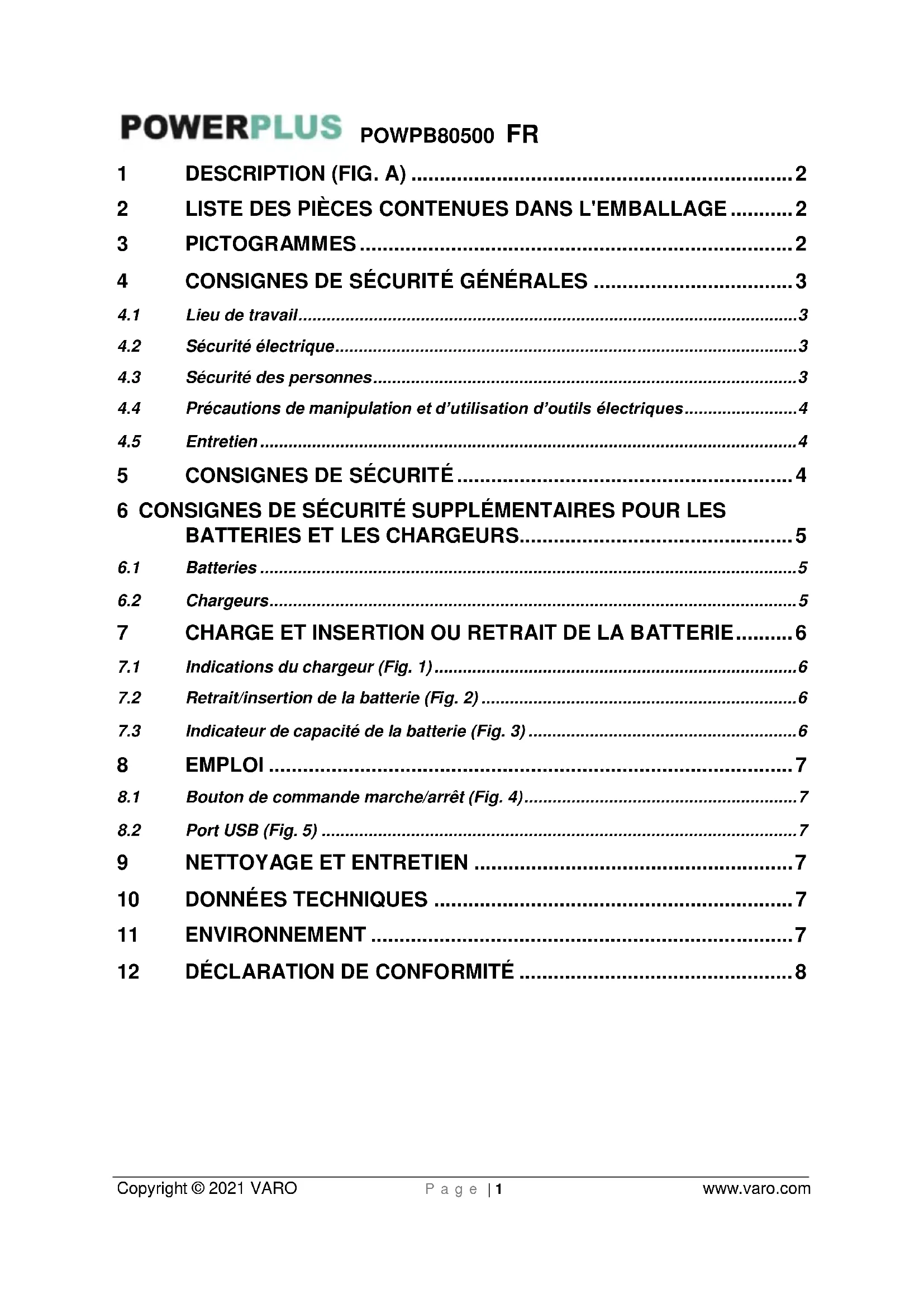 Température ambiante de 40 °C max. (uniquement pour la batterie).POWPB80500 FR Copyright © 2021 VARO P a g e | 3 www.varo.com