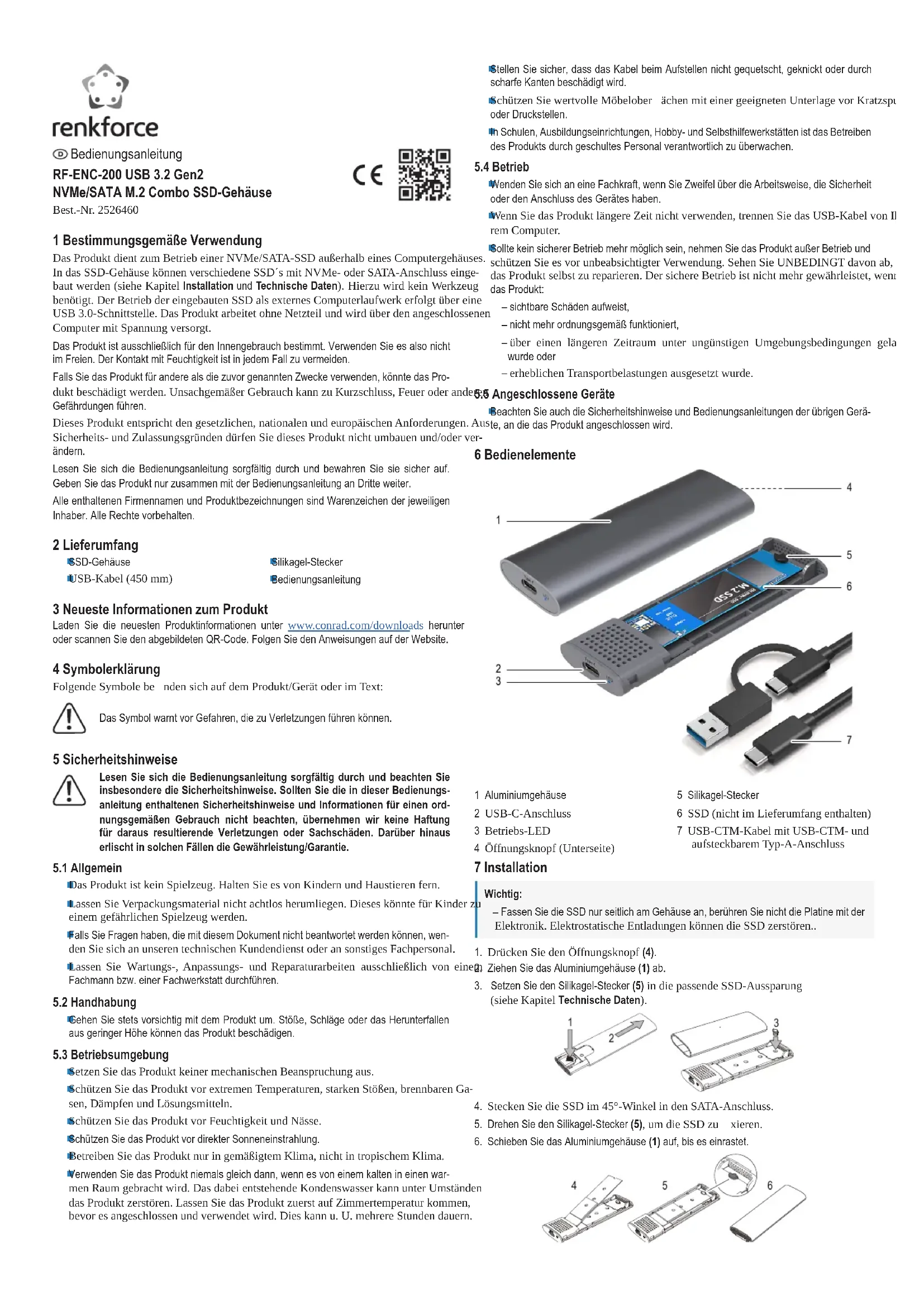 Mode d'emploi Boîtier SSD combo RF-ENC-200 USB 3.2 Gen2 NVMe/SATA M.2 N° de commande 2526460 1 Utilisation prévue Le produit sert à faire fonctionner un NVMe/SATA-SSD à l’extérieur d’une tour d’ordinateur. Le boîtier SSD peut être équipé de différents disques SSD avec connexion NVMe ou SATA (voir le chapitre installation et caractéristiques techniques). Aucun outil n’est nécessaire pour cela. L’utilisation du disque SSD inséré comme lecteur externe d’un ordinateur s’effectue par interface USB 3.0. Le produit fonctionne sans bloc d'alimentation et est alimenté en tension via l'ordinateur connecté. L’appareil est destiné à un usage intérieur uniquement. Ne l’utilisez pas en plein air. Évitez dans tous les cas tout contact avec l’humidité. Si vous utilisez le produit à des ns autres que celles décrites précédemment, vous risquez de l’endommager. Une utilisation inappropriée peut entraîner un court-circuit, un incendie ou d'autres dangers. Ce produit est conforme aux exigences des normes européennes et nationales en vigueur. Pour des raisons de sécurité et d’homologation, toute transformation et/ou modication du produit est interdite. Lisez attentivement le mode d’emploi et conservez-le dans un endroit sûr. Transmettez tou- jours le mode d'emploi avec le produit, si vous le donnez à un tiers. Tous les noms d’entreprises et appellations de produits contenus dans ce mode d’emploi sont des marques déposées de leurs propriétaires respectifs. Tous droits réservés. 2 Contenu de l’emballage