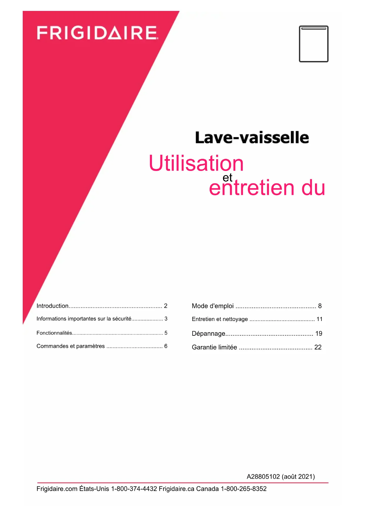 - Garantie limitée A28805102 (août 2021) Frigidaire.com États-Unis 1-800-374-4432 Frigidaire.ca Canada 1-800-265-8352 Utilisation p. 22