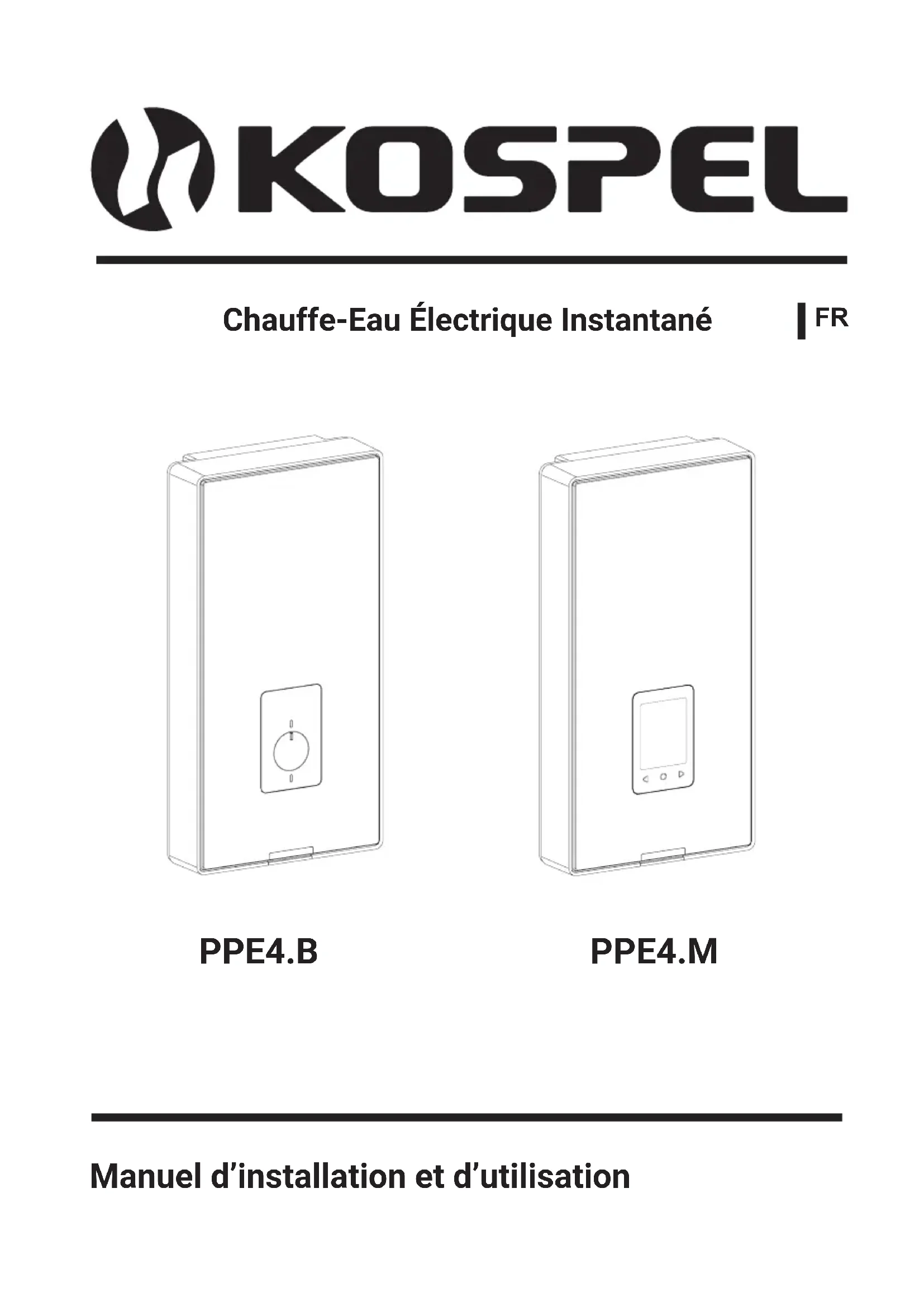 Déclaration de conformité; normes et directives de référence Avis de protection des données personnelles Pour utiliser le module de commande à distance du chauffe-eau, vous devez télécharger une application gratuite. Des informations détaillées concernant la protection des données personnelles sont disponibles sur le site du fabricant à l’adresse www.kospel.pl, sous l’onglet „Politique de condentialité”. KOSPEL Sp. z o.o. déclare sous sa seule responsabilité que les chauffe-eau électriques sans réservoir de type PPE4 spéciés dans ce manuel sont conformes aux directives européennes et à leurs normes de sécurité correspondantes pour les appareils électroménagers: LVD (2014/35/EU) EMC (2014/30/EU) RED (2014/53/EU) et portent le symbole suivant La version complète de cette déclaration de conformité est disponible sur le site du fabricant: www.kospel.plKOSPEL Sp. z o.o. 75-136 Koszalin, ul. Olchowa 1, Poland tel. +48 94 31 70 565 serwis@kospel.pl www.kospel.pl Made in Poland