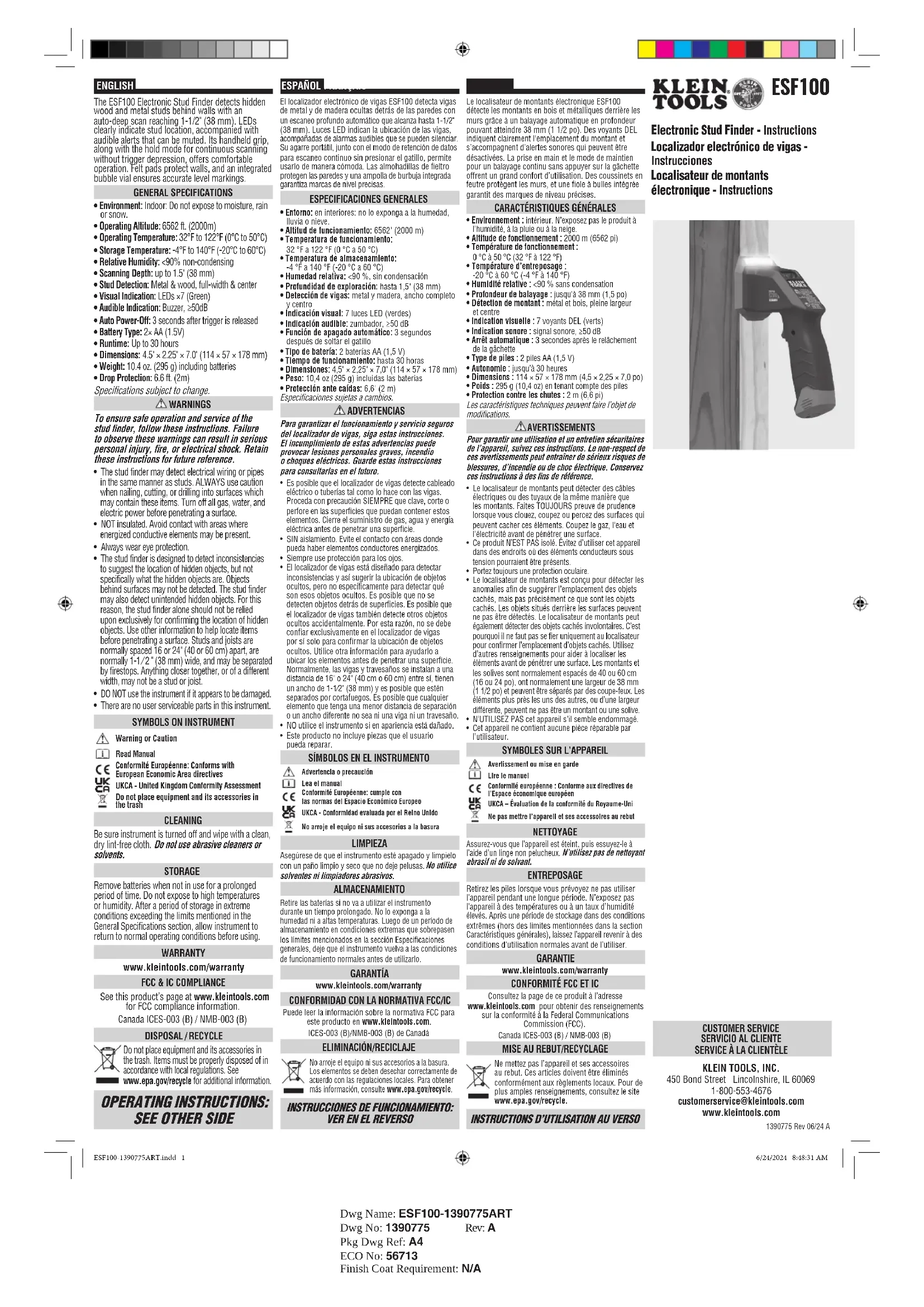 Le localisateur de montants électroniqueESF100 détecte les montants en bois et métalliques derrière les murs grâce à un balayage automatique en profondeur pouvant atteindre 38mm (11/2po). Des voyants DEL indiquent clairement l’emplacement du montant et s’accompagnent d’alertes sonores qui peuvent être désactivées. La prise en main et le mode de maintien pour un balayage continu sans appuyer sur la gâchette offrent un grand confort d’utilisation. Des coussinets en feutre protègent les murs, et une fiole à bulles intégrée garantit des marques de niveau précises.CARACTÉRISTIQUES GÉNÉRALES• Environnement: intérieur. N’exposez pas le produit à l’humidité, à la pluie ou à la neige.• Altitude de fonctionnement: 2000m (6562pi)• Température de fonctionnement: 0°C à 50°C (32°F à 122°F)• Température d’entreposage: -20°C à 60°C (-4°F à 140°F)• Humidité relative: <90% sans condensation• Profondeur de balayage: jusqu’à 38mm (1,5po)• Détection de montant: métal et bois, pleine largeur et centre • Indication visuelle: 7voyants DEL (verts)• Indication sonore: signal sonore, ≥50dB• Arrêt automatique: 3secondes après le relâchement de la gâchette• Type de piles: 2pilesAA (1,5V)• Autonomie: jusqu’à 30heures• Dimensions: 114×57×178mm (4,5×2,25×7,0po)• Poids: 295g (10,4oz) en tenant compte des piles• Protection contre les chutes: 2m (6,6pi)Les caractéristiques techniques peuvent faire l’objet de modifications.AVERTISSEMENTSPour garantir une utilisation et un entretien sécuritaires de l’appareil, suivez ces instructions. Le non-respect de ces avertissements peut entraîner de sérieux risques de blessures, d’incendie ou de choc électrique. Conservez ces instructions à des ns de référence.• Le localisateur de montants peut détecter des câbles électriques ou des tuyaux de la même manière que les montants. Faites TOUJOURS preuve de prudence lorsque vous clouez, coupez ou percez des surfaces qui peuvent cacher ces éléments. Coupez le gaz, l’eau et l’électricité avant de pénétrer une surface.• Ce produit N’EST PAS isolé. Évitez d’utiliser cet appareil dans des endroits où des éléments conducteurs sous tension pourraient être présents.• Portez toujours une protection oculaire.• Le localisateur de montants est conçu pour détecter les anomalies afin de suggérer l’emplacement des objets cachés, mais pas précisément ce que sont les objets cachés. Les objets situés derrière les surfaces peuvent ne pas être détectés. Le localisateur de montants peut également détecter des objets cachés involontaires. C’est pourquoi il ne faut pas se fier uniquement au localisateur pour confirmer l’emplacement d’objets cachés. Utilisez d’autres renseignements pour aider à localiser les éléments avant de pénétrer une surface. Les montants et les solives sont normalement espacés de 40 ou 60cm (16 ou 24po), ont normalement une largeur de 38mm (11/2po) et peuvent être séparés par des coupe-feux. Les éléments plus près les uns des autres, ou d’une largeur différente, peuvent ne pas être un montant ou une solive.• N’UTILISEZ PAS cet appareil s’il semble endommagé. • Cet appareil ne contient aucune pièce réparable par l’utilisateur.SYMBOLES SUR L’APPAREIL Avertissement ou mise en garde Lire le manuel Conformité européenne: Conforme aux directives de l’Espace économique européen UKCA– Évaluation de la conformité du Royaume-Uni Ne pas mettre l’appareil et ses accessoires au rebut NETTOYAGEAssurez-vous que l’appareil est éteint, puis essuyez-le à l’aide d’un linge non pelucheux. N’utilisez pas de nettoyant abrasif ni de solvant.ENTREPOSAGERetirez les piles lorsque vous prévoyez ne pas utiliser l’appareil pendant une longue période. N’exposez pas l’appareil à des températures ou à un taux d’humidité élevés. Après une période de stockage dans des conditions extrêmes (hors des limites mentionnées dans la section Caractéristiques générales), laissez l’appareil revenir à des conditions d’utilisation normales avant de l’utiliser.GARANTIEwww.kleintools.com/warrantyCONFORMITÉ FCC ET ICConsultez la page de ce produit à l’adresse www.kleintools.com pour obtenir des renseignements sur la conformité à la Federal Communications Commission (FCC).CanadaICES-003(B)/ NMB-003(B)MISE AU REBUT/RECYCLAGENe mettez pas l’appareil et ses accessoires au rebut. Ces articles doivent être éliminés conformément aux règlements locaux. Pour de plus amples renseignements, consultez le site www.epa.gov/recycle.