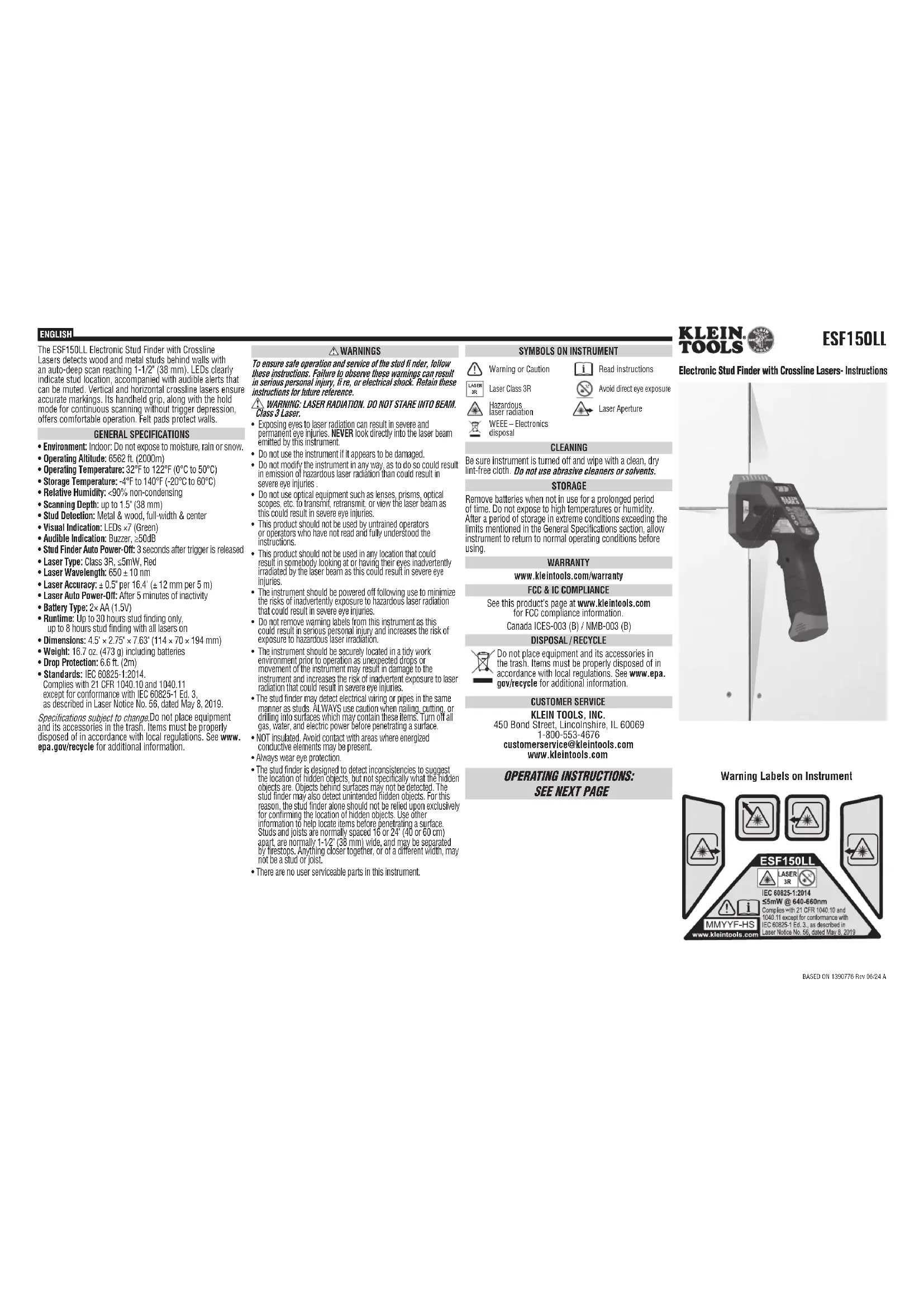 Retrouvez gratuitement la notice de l'appareil ESF150LL Klein Tools au format PDF.