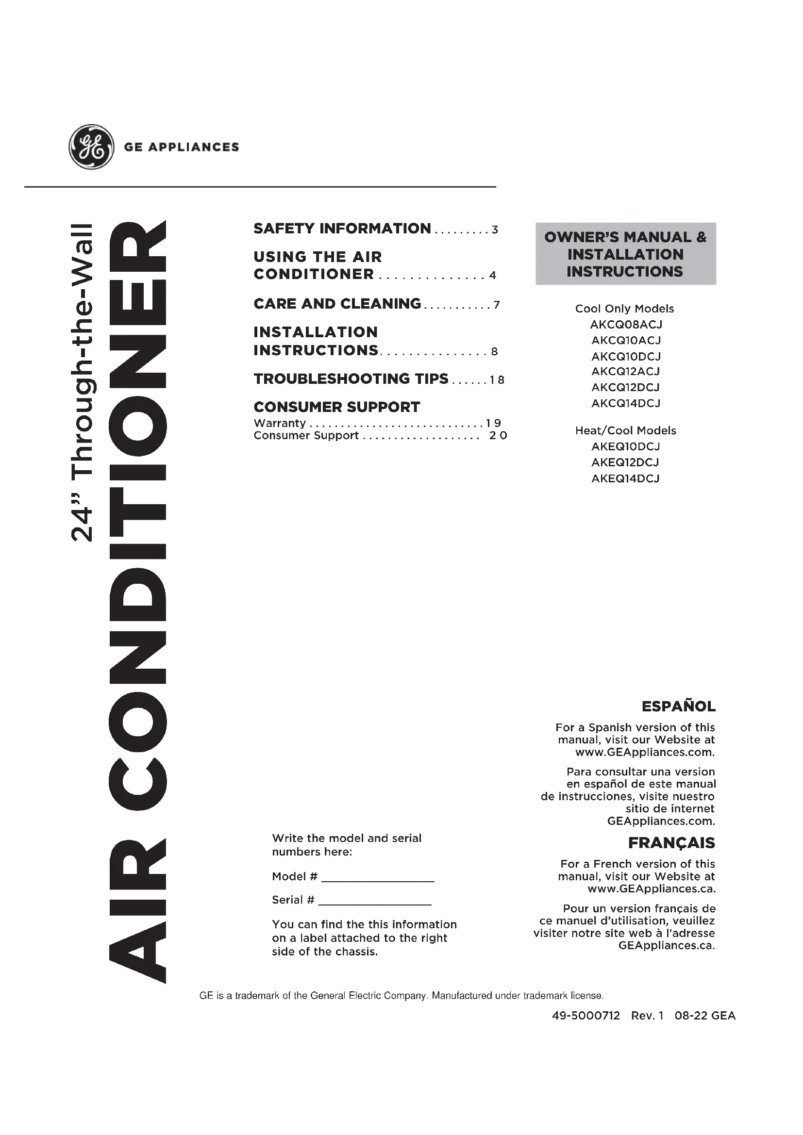 ET INSTRUCTIONS D’INSTALLATION Rafraîchissement uniquement AKCQ08ACJ AKCQ10ACJ AKCQ10DCJ AKCQ12ACJ AKCQ12DCJ AKCQ14DCJ Réchauffement/Rafraîchessment AKEQ10DCJ AKEQ12DCJ AKEQ14DCJ2 49-5000712 Rev. 1 NOUS VOUS REMERCIONS D’ACCUEILLIR GE APPLIANCES CHEZ VOUS Que vous ayez grandi avec GE Appliances ou qu’il s’agisse de votre première acquisition, nous sommes heureux de vous accueillir dans notre famille. Nous sommes fiers du savoir-faire, de l’innovation et de l’esthétique qui composent chaque appareil GE Appliances, et nous pensons que vous le serez aussi. Dans cette optique, nous vous rappelons que l’enregistrement de votre électroménager vous assure la communication de renseignements importants sur le produit et la garantie lorsque vous en avez besoin. Enregistrez votre électroménager GE en ligne dès maintenant. Des sites Web et des numéros de téléphone utiles figurent dans la section Soutien au consommateur de ce manuel d’utilisation.49-5000712 Rev. 1 3 Pour votre sécurité, vous devez suivre les instructions de ce manuel pour réduire les risques d’incendie, d’explosion, de choc électrique, de dommage à la propriété, de blessure ou de décès.Ŷ1¶XWLOLVH]FHWDSSDUHLOTXHSRXUVRQXVDJHSUpYXWHOTXHdécrit dans le Manuel de l’utilisateur.Ŷ9RXVGHYH]ELHQPRQWHUFHFRQGLWLRQQHXUFRQIRUPpPHQWaux Instructions de montage, avant de l’utiliser.Ŷ1HGpEUDQFKH]MDPDLVYRWUHFRQGLWLRQQHXUHQWLUDQWVXUle cordon d’alimentation. Saisissez fermement la fiche et sortez-la droit de sa prise. Ŷ5HPSODFH]LPPpGLDWHPHQWWRXWFRUGRQG¶DOLPHQWDWLRQabîmé ou endommagé. Un cordon d’alimentation électrique endommagé ne doit pas être réparé mais plutôt remplacé par un autre cordon d’alimentation obtenu du fabricant. N’utilisez pas un cordon d’alimentation qui montre des fissures ou des signes d’abrasion sur sa longueur ou encore près de la prise ou du connecteur.ŶeWHLJQH]HWGpEUDQFKH]YRWUHFOLPDWLVHXUDYDQWGHSURFpGHUà une réparation ou un nettoyage.Ŷ3RXUYRWUHVpFXULWp«QHUDQJH]MDPDLVRXQ¶XWLOLVH]MDPDLVdes matériaux combustibles, de l’essence ou d’autres vapeurs ou liquides inflammables à proximité de cet appareil ou de tout autre appareil électroménager. Ŷ6LODSULVHpOHFWULTXHQ¶HVWSDVFRPSDWLEOHDYHFODILFKHdu cordon électrique, il faut faire remplacer la prise par un électricien agréé.Ŷ*($SSOLDQFHVQREULQGDVRSRUWHVREUHQLQJ~QVHUYLFLRtécnico de componentes del sistema sellado (es decir: piezas que contengan refrigerante) del acondicionador de aire.Ŷ(OVHUYLFLRWpFQLFRGHOUHVWRGHORVFRPSRQHQWHV6Ï/2podrá ser completado por un técnico calificado.Ŷ(VWHHOHFWURGRPpVWLFRQRGHEHUiVHUXVDGRSRUSHUVRQDV(incluyendo niños) con capacidades físicas, sensoriales o mentales reducidas o con falta de experiencia y conocimiento, a menos que cuenten con supervisión o instrucción con relación al uso de este electrodoméstico por parte de una persona responsable de su seguridad.Ŷ6HGHEHUiVXSHUYLVDUDORVQLxRVDILQGHDVHJXUDUTXHQRVHMXHJXHFRQHOHOHFWURGRPpVWLFRŶ1RXWLOLFHVXDFRQGLFLRQDGRUGHDLUHHQXQDKDELWDFLyQK~PHGDWDOFRPRXQEDxRRODYDGHURŶ(OHOHFWURGRPpVWLFRVHGHEHUiJXDUGDUDILQGHHYLWDUTXHse produzcan daños mecánicos.