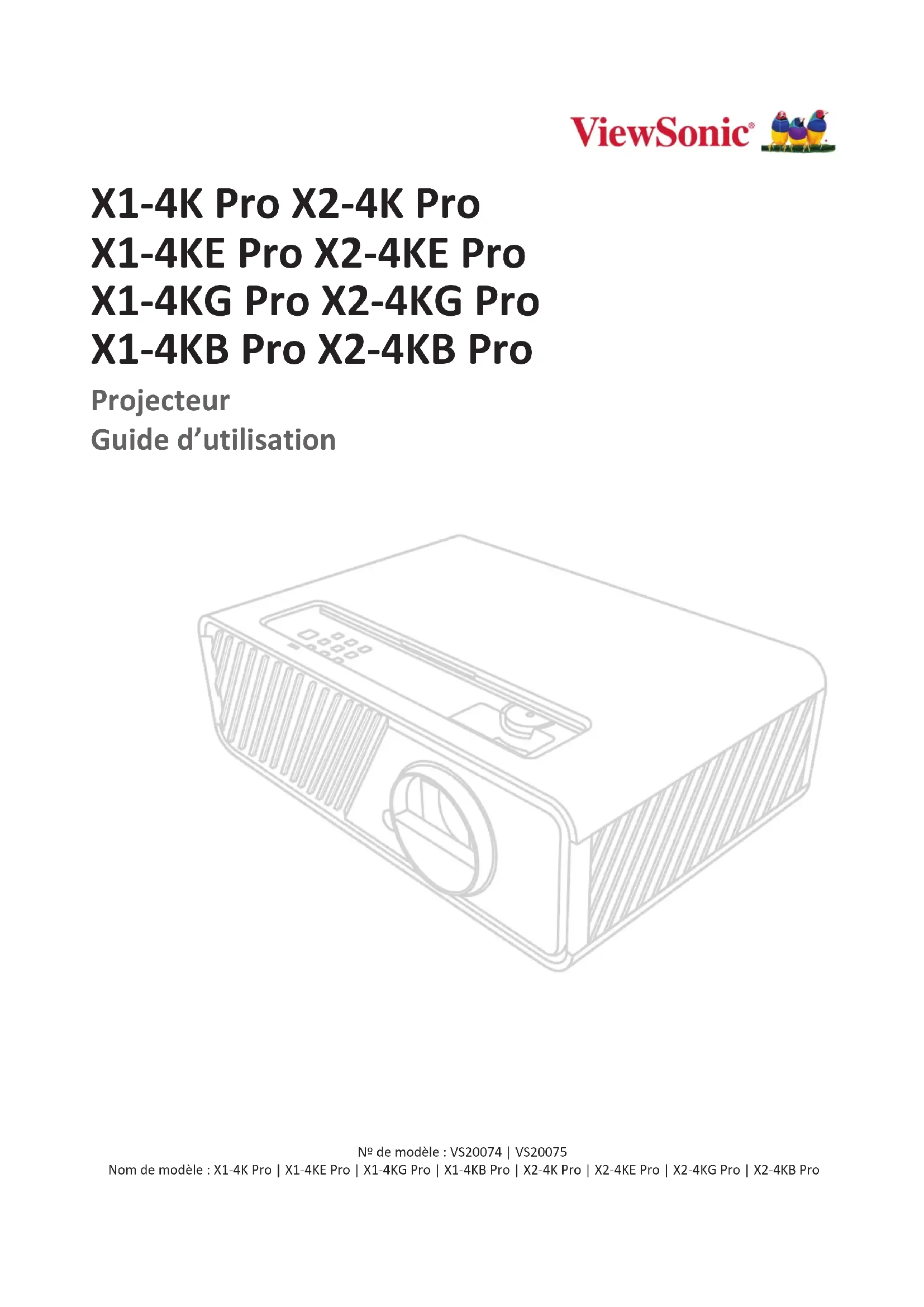 X1-4K Pro X2-4K Pro X1-4KE Pro X2-4KE Pro X1-4KG Pro X2-4KG Pro X1-4KB Pro X2-4KB Pro Projecteur Guide d’utilisation Nº de modèle : VS20074 | VS20075 Nom de modèle : X1-4K Pro | X1-4KE Pro | X1-4KG Pro | X1-4KB Pro | X2-4K Pro | X2-4KE Pro | X2-4KG Pro | X2-4KB Pro2 Merci d’avoir choisi ViewSonic® En tant que leader mondial de solutions visuelles, ViewSonic® se consacre à dépasser les attentes du monde en matière d’évolution technologique, d’innovation et de simplicité. Chez ViewSonic®, nous pensons que nos produits peuvent avoir un impact positif dans le monde et nous sommes convaincus que le produit ViewSonic® que vous avez choisi vous servira correctement. Une fois de plus, merci d’avoir choisi ViewSonic® !3 Précautions relatives à la sécurité Veuillez lire les Précautions de sécurité suivantes avant de commencer à utiliser le projecteur.
