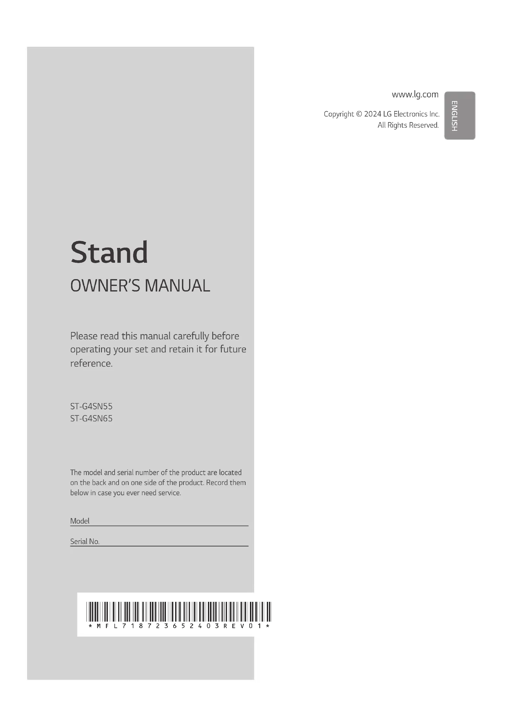 Veuillez lire attentivement ce manuel avant de mettre en service votre produit et conservez-le afin de pouvoir vous y référer ultérieurement. ST-G4SN55ST-G4SN65Le nom du modèle et le numéro de série sont indiqués à l'arrière et sur le côté du produit. Inscrivez-les ci-dessous pour référence ultérieure.ModèleNº de série BARQUETTE ÉTUI