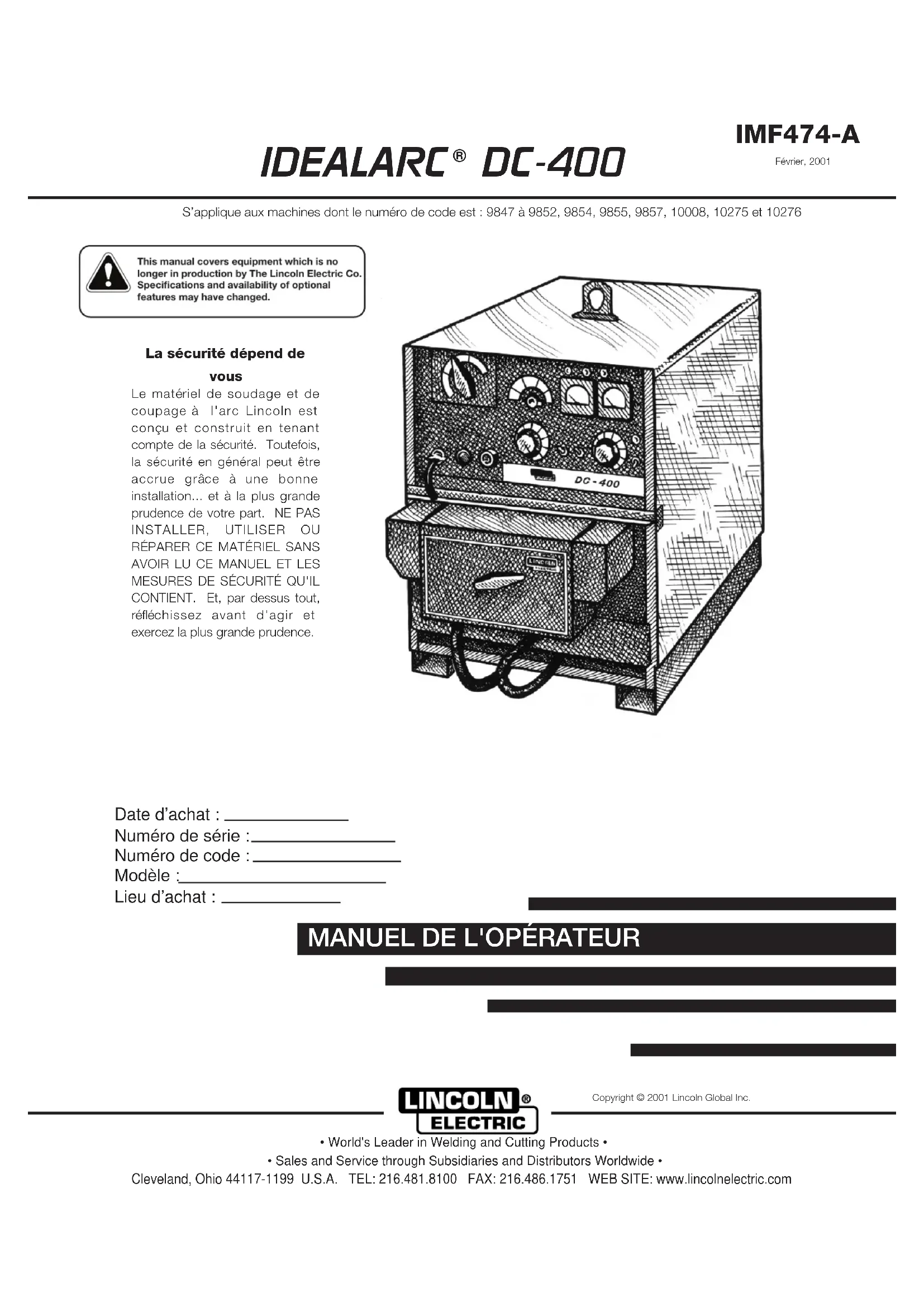 Idealarc DC-400 - Poste à souder LINCOLN ELECTRIC - Notice d'utilisation et mode d'emploi gratuit