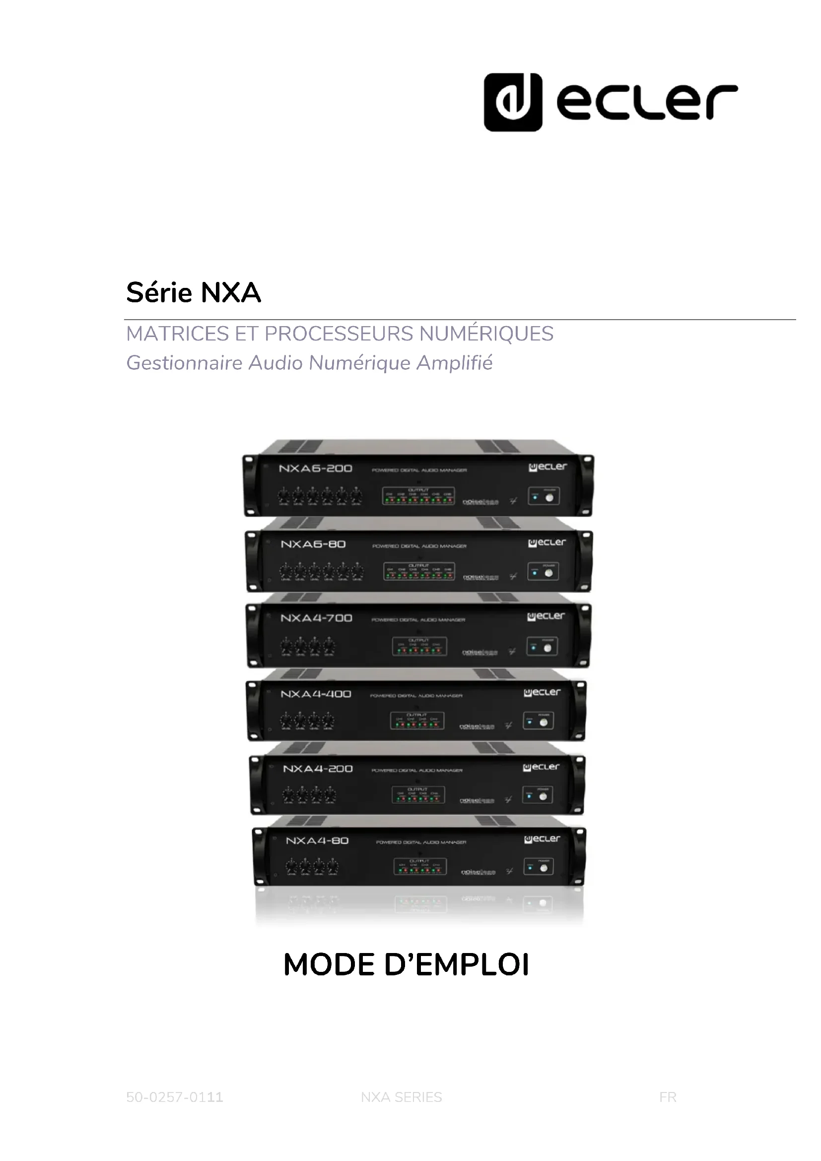 que déchet urbain non sélectionné. Allez au centre de traitement des déchets électriques et électroniques le plus proche. NEEC AUDIO BARCELONA, S.L décline toute responsabilité pour les dommages qui pourraient être causés à des personnes, des animaux ou des objets par le non-respect des avertissements ci-dessus.5 3 NOTE IMPORTANTE Merci d'avoir choisi notre appareil Gestionnaire Audio Numérique Amplifié de la Série NXA. Il est TRÈS IMPORTANT de lire attentivement ce mode d’emploi et d'en comprendre parfaitement le contenu avant d’effectuer toute connexion afin de maximiser votre utilisation et de tirer les meilleures performances de cet équipement. Pour garantir le bon fonctionnement de cet appareil, nous recommandons que sa maintenance soit assurée par nos services techniques agréés. Tous les produits ECLER bénéficient de garantie, veuillez-vous référer sur www.ecler.com ou la carte de garantie incluse avec cet appareil pour la période de validité et ses conditions. 4 INTRODUCTION La série NXA comprend 4 modèles à 4 canaux et 2 autres à 6 canaux :