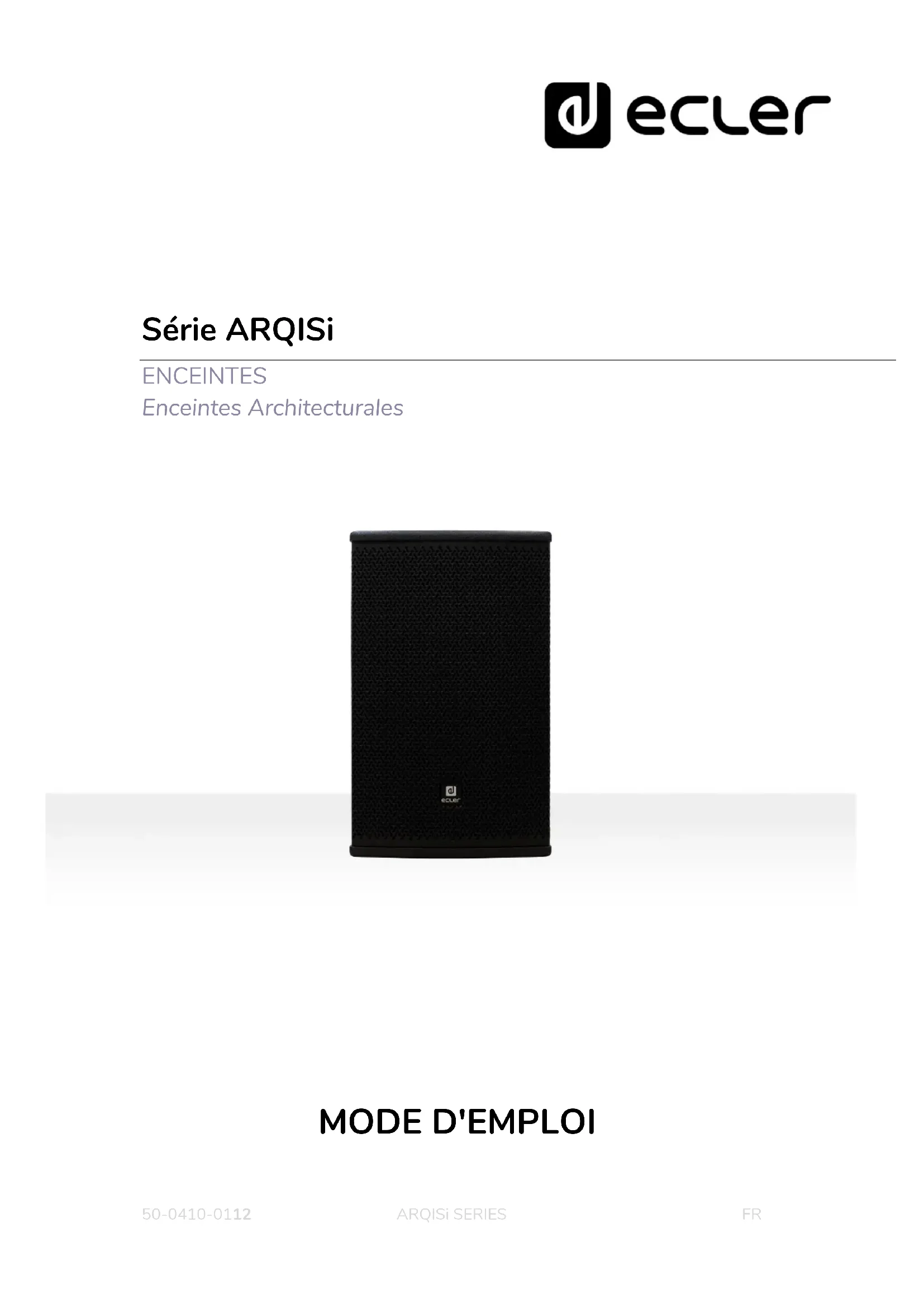 ménagers non triés. Rapportez-le au centre de traitement des déchets électriques et électroniques le plus proche. NEEC AUDIO BARCELONA, S.L. décline toute responsabilité pour les dommages qui pourraient être causés aux personnes, animaux ou objets suite au non-respect des avertissements ci-dessus.5 NOTE IMPORTANTE Merci d'avoir choisi nos enceintes ARQISi Ecler ! Il est TRÈS IMPORTANT de lire attentivement ce mode d’emploi et d'en comprendre parfaitement le contenu avant d’effectuer toute connexion afin de maximiser votre utilisation et de tirer les meilleures performances de cet équipement. Pour garantir le bon fonctionnement de cet appareil, nous recommandons que sa maintenance soit assurée par nos services techniques agréés. Tous les produits ECLER bénéficient de garantie, veuillez-vous référer sur www.ecler.com ou la carte de garantie incluse avec cet appareil pour la période de validité et ses conditions. INTRODUCTION Mise au point après étude auprès des installateurs et des professionnels de l'aménagement intérieur et de l'intégration de systèmes, ainsi que grâce à un contact permanent avec eux, la gamme d'enceintes ARQISi est conçue pour une installation fixe, notamment dans les environnements nécessitant une enceinte compacte offrant un rendement élevé, une installation facile, une fiabilité à long terme et une excellente qualité sonore. Évolution de la célèbre série ARQIS, les enceintes ARQISi sont réglées avec précision pour équilibrer le son sur tout le spectre, améliorer la réponse en fréquence, augmenter la puissance (ARQIS110i, ARQIS112i) et apportent un nouveau modèle de caisson de basses (ARQISSB12i). Les modèles 105, 106 et 108 comprennent un nouveau support de fixation murale VEASY, compatible avec la norme de montage VESA, facile à installer et avec réglage vertical et horizontal. L'ensemble de la gamme possède un logo carré qui peut être tourné à 90° sans outil.6 La série ARQISi est idéale entre autres pour les centres commerciaux, les complexes sportifs, les théâtres/auditoriums, les salles de conférence, les présentations audiovisuelles, les salles d'entreprise, le renforcement de périmètre en club, les cafés, les restaurants et les parcs à thème. MODÈLES 5.1. ARQIS105i