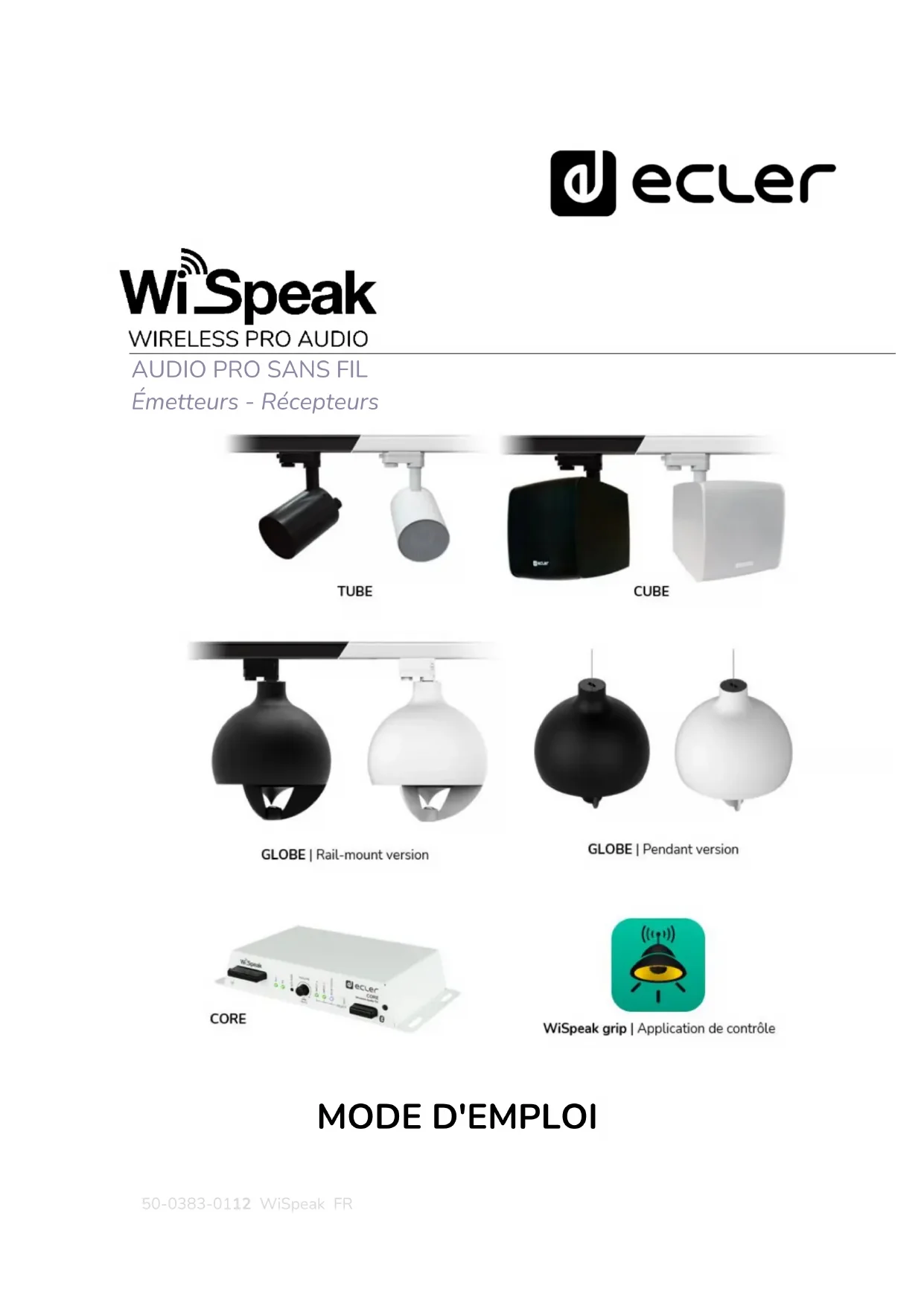 MODE D'EMPLOI52 INTRODUCTION WiSpeak grip WiSpeak grip est une appli Android/iOS pour la configuration et le contrôle d'un système audio sans fil WiSpeak. Elle est compatible avec Android 5.0 ou plus récent/ iOS11 ou plus récent. Un système WiSpeak se compose d'un émetteur (modèle CORE) et de 1 à 24 récepteurs (modèles TUBE ou CUBE) parmi lesquels :