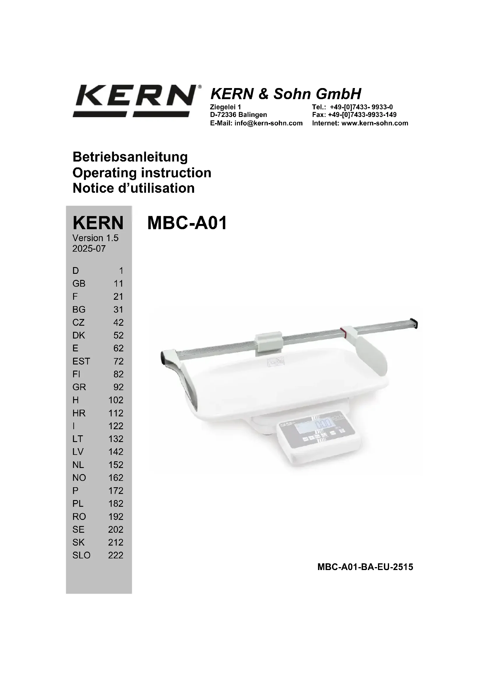 ± 0.5MBC-A01-BA-EU-2515 23 2 Déclaration de conformité Vous pouvez trouver la déclaration UE/CE en ligne sur: www.kern-sohn.com/ce