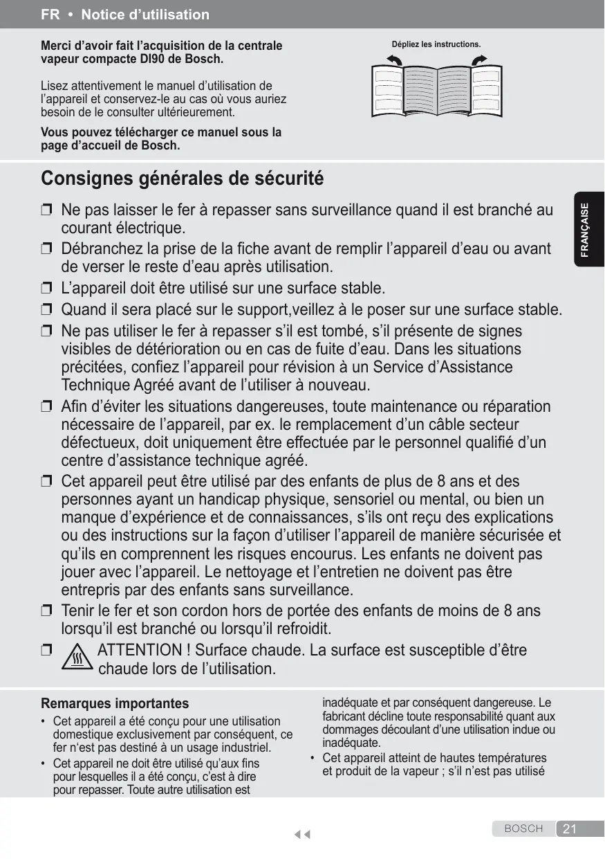 FR • Notice d’utilisation Merci d’avoir fait l’acquisition de la centrale vapeur compacte DI90 de Bosch.
