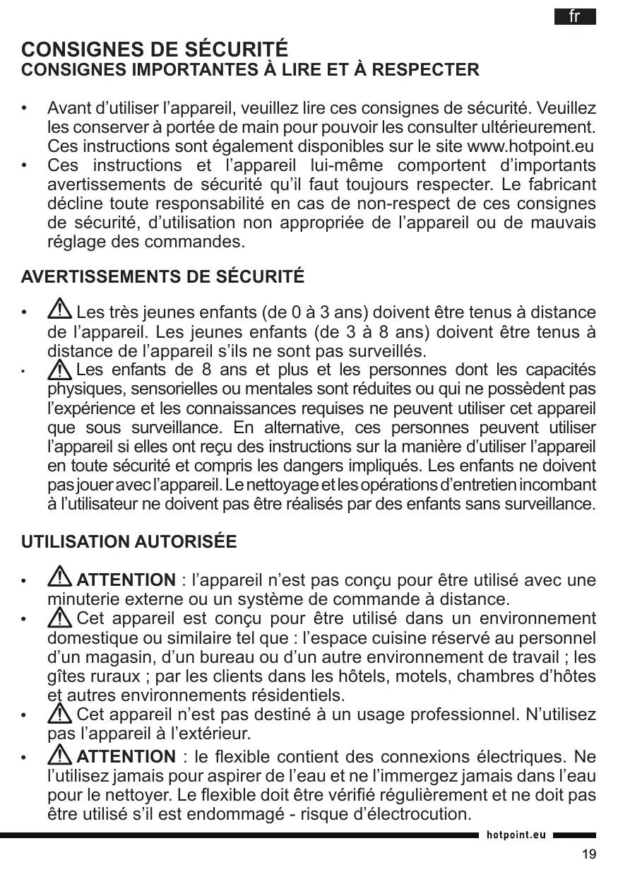 - Avant d'utiliser l'appareil, veuillez lore ces consignes de sécurité. Veuillez les conserver à portée de main pour pouvoir les consulter ultérieurement. Ces instructions sont également disponibles sur le site www.hotpoint.eu