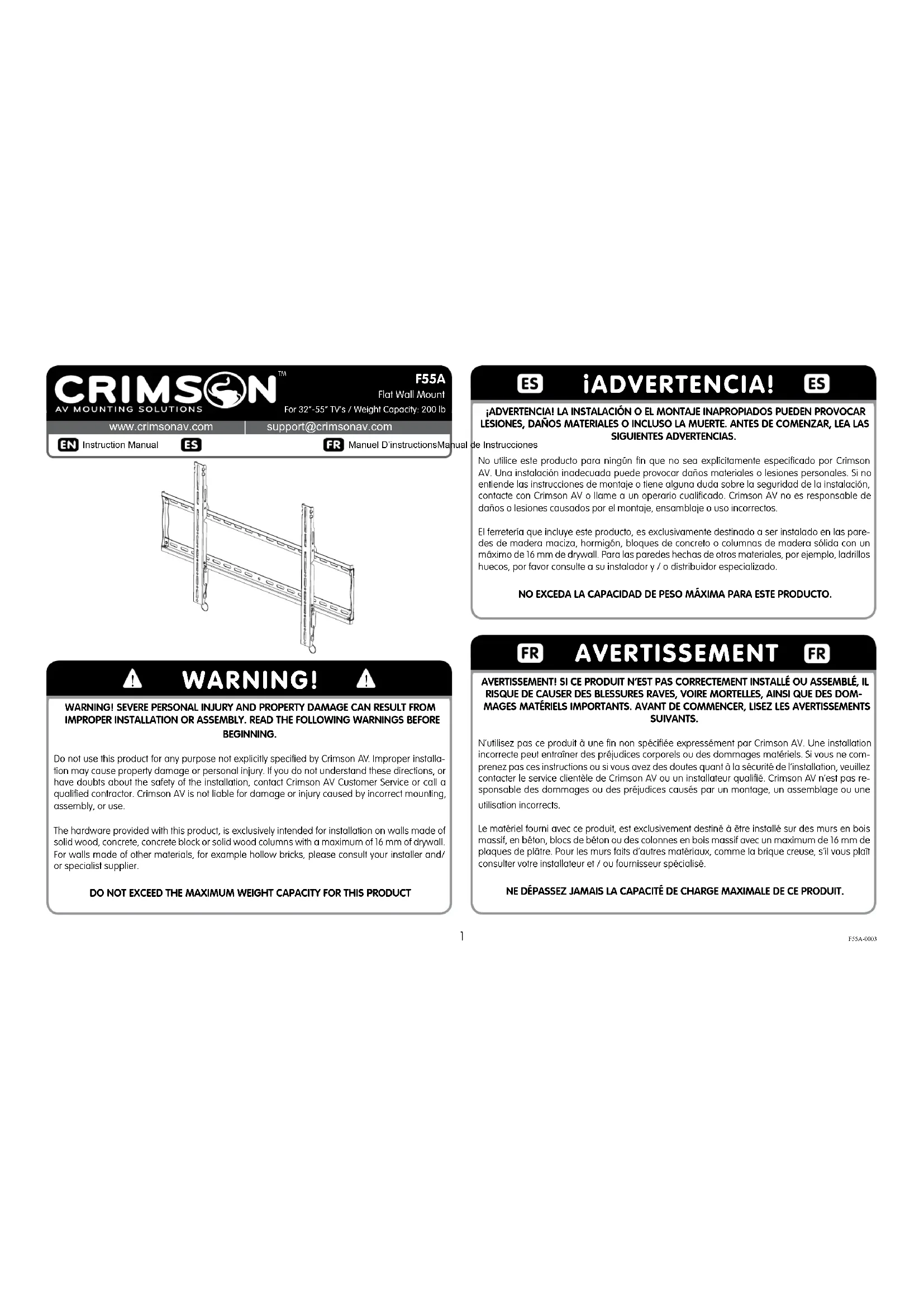 WARNING! SEVERE PERSONAL INJURY AND PROPERTY DAMAGE CAN RESULT FROM IMPROPER INSTALLATION OR ASSEMBLY. READ THE FOLLOWING WARNINGS BEFORE BEGINNING. Do not use this product for any purpose not explicitly specied by Crimson AV. Improper installa- tion may cause property damage or personal injury. If you do not understand these directions, or have doubts about the safety of the installation, contact Crimson AV Customer Service or call a qualied contractor. Crimson AV is not liable for damage or injury caused by incorrect mounting, assembly, or use.The hardware provided with this product, is exclusively intended for installation on walls made of solid wood, concrete, concrete block or solid wood columns with a maximum of 16 mm of drywall. For walls made of other materials, for example hollow bricks, please consult your installer and/or specialist supplier.DO NOT EXCEED THE MAXIMUM WEIGHT CAPACITY FOR THIS PRODUCT WARNING! AVERTISSEMENT! SI CE PRODUIT N’EST PAS CORRECTEMENT INSTALLÉ OU ASSEMBLÉ, IL RISQUE DE CAUSER DES BLESSURES RAVES, VOIRE MORTELLES, AINSI QUE DES DOM-MAGES MATÉRIELS IMPORTANTS. AVANT DE COMMENCER, LISEZ LES AVERTISSEMENTS SUIVANTS.N’utilisez pas ce produit à une n non spéciée expressément par Crimson AV. Une installation incorrecte peut entraîner des préjudices corporels ou des dommages matériels. Si vous ne com-prenez pas ces instructions ou si vous avez des doutes quant à la sécurité de l’installation, veuillez contacter le service clientèle de Crimson AV ou un installateur qualié. Crimson AV n’est pas re- sponsable des dommages ou des préjudices causés par un montage, un assemblage ou une utilisation incorrects.Le matériel fourni avec ce produit, est exclusivement destiné à être installé sur des murs en bois massif, en béton, blocs de béton ou des colonnes en bois massif avec un maximum de 16 mm de plaques de plâtre. Pour les murs faits d’autres matériaux, comme la brique creuse, s’il vous plaît consulter votre installateur et / ou fournisseur spécialisé.NE DÉPASSEZ JAMAIS LA CAPACITÉ DE CHARGE MAXIMALE DE CE PRODUIT. AVERTISSEMENT2 F55A-0003 PACKAGE CONTENTS Contenido del paquete Contenu de l’emballage