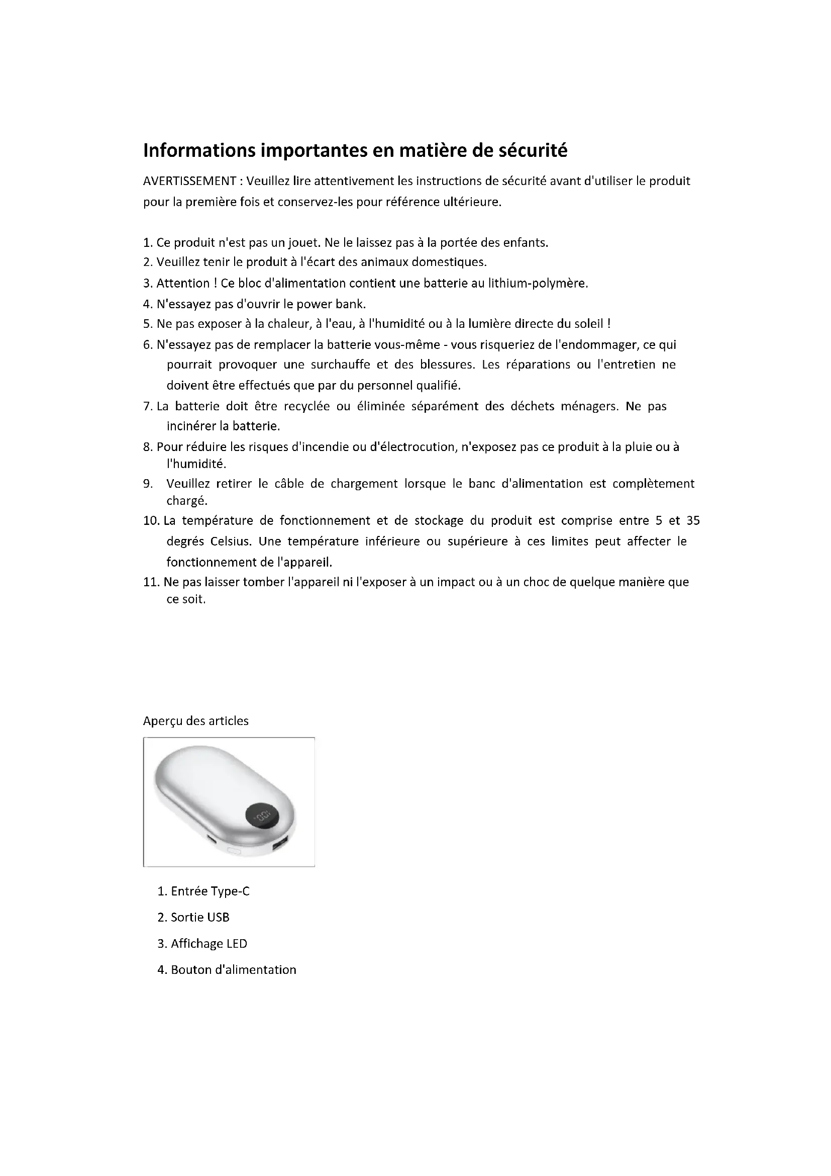- Sortie USB : 5V/2A *Gamme de température : 35-52 degrés *Avec indicateur de niveau de batterie Charger le power bank
