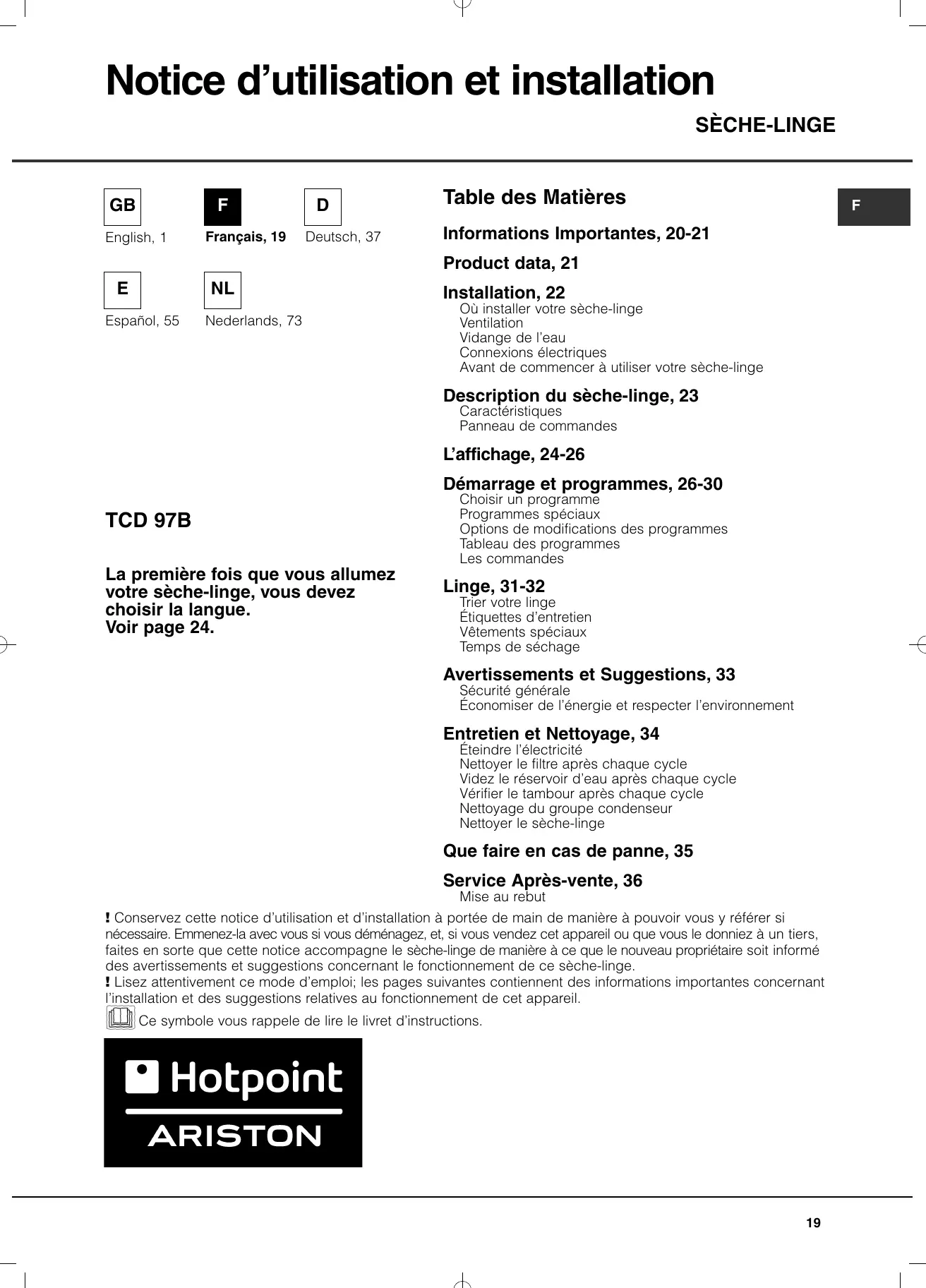 Retrouvez gratuitement la notice de l'appareil TCD 97B 6HY/N HOTPOINT au format PDF.