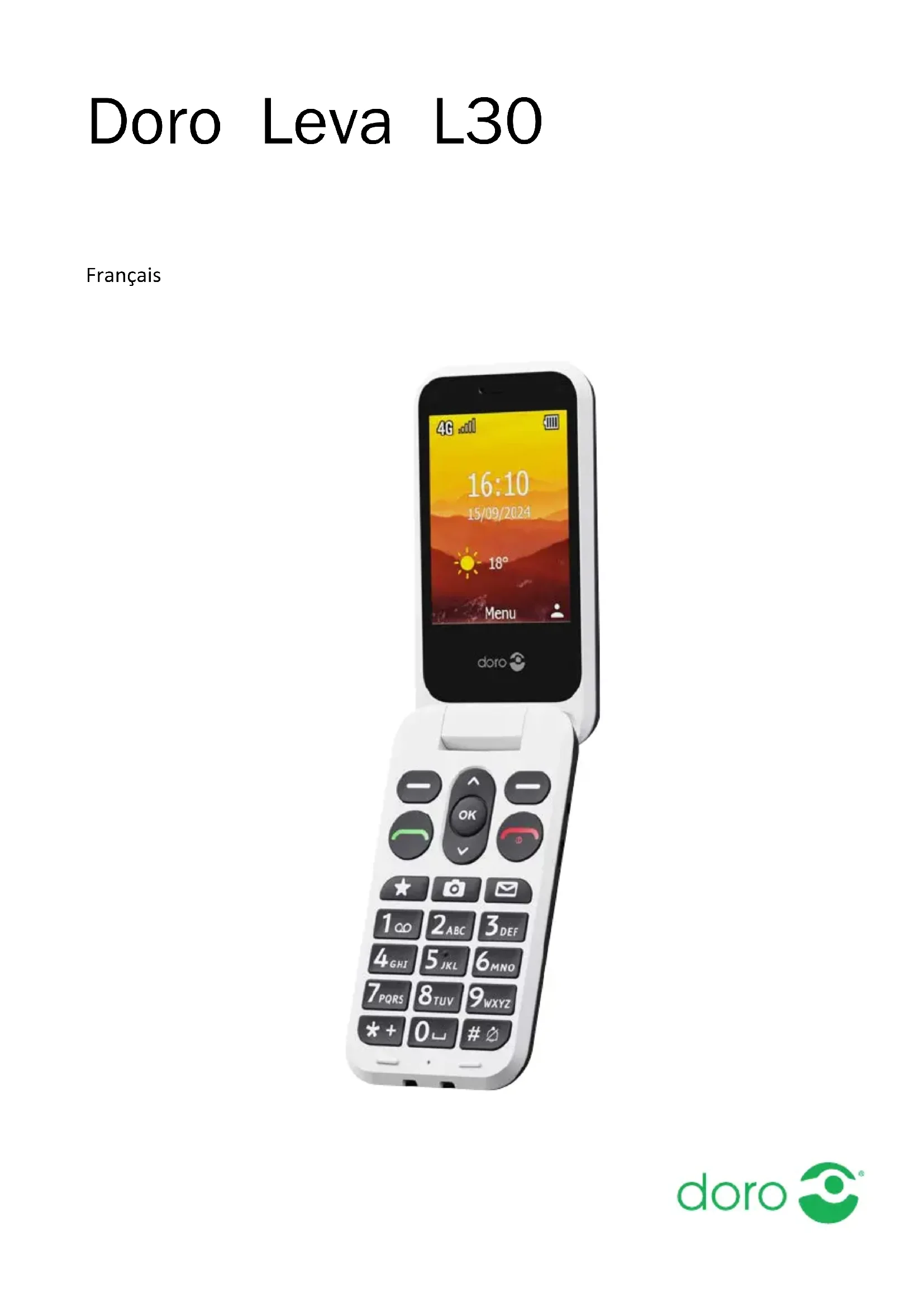 - T : pour utiliser votre prothèse auditive sous ce mode, vérifiez qu’elle est réglée en mode T ou en mode de couplage par phonocapteur (ce mode n’est pas disponible sur toutes les prothèses auditives). Pour des résultats optimaux, essayez d’utiliser le télé- phone dans différentes positions par rapport à votre prothèse auditive. Par exemple, placer le combiné légèrement sous l’oreille ou face à celle-ci peut présenter de meilleu- res performances. Votre appareil satisfait au niveau nominal M3/T4. 72Français Débit d’absorption spécifique (DAS) Cet appareil est conforme aux normes de sécurité internationales concernant l’exposition aux fréquences radioélectriques. Votre appareil portable est un émetteur-récepteur radio. Il est conçu pour ne pas dépasser les limites d’exposition aux fréquences radio (champs électromagnétiques de fréquence radio) recommandées par les directives internationales de l’organisation scientifique indépendante ICNIRP (Commission internationale de protec- tion contre les rayonnements non ionisants). L’OMS (Organisation mondiale de la santé) a déclaré que les informations scientifiques ac- tuelles n’indiquent pas le besoin de prendre des précautions particulières quelconques pour utiliser des appareils portables. Si vous souhaitez réduire votre exposition, elle re- commande de limiter l’utilisation de ces appareils ou d’utiliser un dispositif mains libres pour éloigner l’appareil de votre tête et de votre corps. Pour plus d’informations sur les valeurs de DAS (débit d’absorption spécifique) de votre appareil, veuillez lire la documentation fournie avec votre appareil. Recyclage Doro assume la responsabilité de l’ensemble du cycle de vie de ses produits, y compris de leur recyclage en fin de vie. Votre ancien produit peut encore être utile à quelqu’un d’au- tre et, s’il est arrivé en fin de vie, les matériaux qu’il contient peuvent être utilisés pour fa- briquer de nouveaux produits. Nous vous recommandons de réutiliser, réparer ou remettre à neuf votre appareil et, si cela n’est pas possible, de le faire recycler conformé- ment aux réglementations locales. N’oubliez pas non plus de recycler les autres anciens composants électroniques non utilisés que vous pourriez avoir. Mise au rebut adaptée de ce produit (Déchets d’équipements électriques et électroniques) (Applicable dans les pays disposant de systèmes de collecte sélective) La présence de ce marquage sur le produit, les accessoires ou le manuel indique que le produit et ses accessoires électroniques (p. ex. chargeur, casque, câble USB) ne doivent pas être mis au rebut avec les autres déchets ménagers. Pour éviter tout dommage nocif pour l’environnement ou pour la santé causé par une mise au rebut non contrôlée des dé- chets, veuillez séparer ces éléments des autres types de déchets et les recycler de manière responsable afin de favoriser la réutilisation durable des matériaux d’origine. Les particu- liers doivent contacter le revendeur auprès de qui ils se sont procuré ce produit ou les au- torités locales pour savoir où déposer ces éléments pour un recyclage respectueux de l’environnement. Les professionnels doivent contacter leur fournisseur et vérifier les ter- mes du contrat d’achat. Ce produit et ses accessoires électroniques ne doivent pas être mélangés avec les autres déchets commerciaux à la mise au rebut. Ce produit est conforme RoHS. 73Français Mise au rebut appropriée des batteries de ce produit (Applicable dans les pays disposant de systèmes de collecte sélective) La présence de ce marquage sur la batterie, le manuel ou l’emballage indique que la bat- terie contenue dans ce produit ne doit pas être mise au rebut avec les autres déchets mé- nagers. Si la batterie n’est pas mise au rebut correctement, ces substances peuvent causer des dommages à la santé ou à l’environnement. Pour protéger les ressources naturelles et favoriser la réutilisation des matériaux, veuillez séparer les batteries des autres types de déchets et les recycler grâce au système de col- lecte de batteries gratuit local. Déclaration de conformité UE Doro déclare par la présente que l’équipement hertzien DFC-0530 (Doro Leva L30) est conforme aux directives : 2014/53/UE et 2011/65/UE, y compris la directive déléguée (UE) 2015/863 modifiant l’annexe II. Le texte intégral de la déclaration de conformité UE est disponible à l’adresse Internet suivante : www.doro.com/dofc. Si un adaptateur secteur est fourni avec votre appareil : Déclaration relative à l’écoconception, efficacité énergétique pour une alimentation électrique externe Par la présente, Doro déclare que l’alimentation électrique externe de cet appareil est conforme à la réglementation de la Commission européenne (UE) 2019/1782 concernant les exigences en matière d’écoconception pour les alimentations électriques externes, en vertu de la directive 2009/125/CE. Pour en savoir plus sur les exigences en matière d’écoconception, consultez la page Web suivante : www.doro.com/ecodesign 74Français 75DFC-0530 (Doro Leva L30) French Version 1.0 ©2024 Doro AB. All rights reserved. www.doro.com REV 22078 — STR 20240708