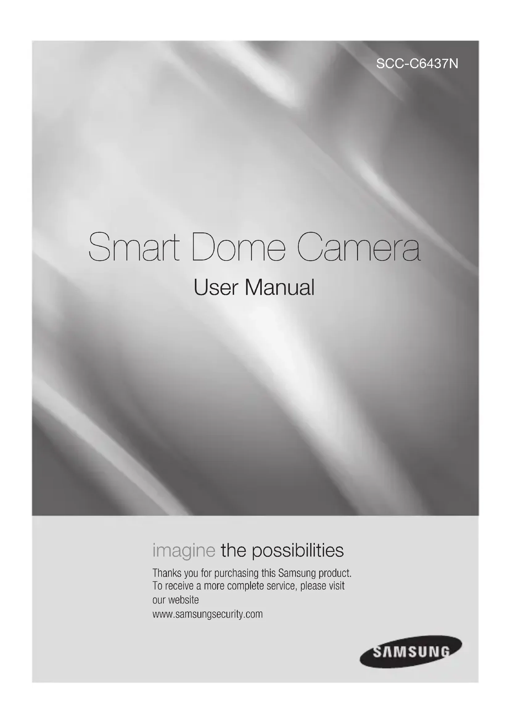 Product Color Light Gray 00882F-NA_SCC-C6437N-ENG-2.indd 50 2009-10-23 13:52:57English _51 English PRODUCT APPEARANCE 00882F-NA_SCC-C6437N-ENG-2.indd 51 2009-10-23 13:52:5700882F-NA_SCC-C6437N-ENG-2.indd 52 2009-10-23 13:52:57Guide d'utilisation Caméra Smart Dome SCC-C6437N Imaginez les possibilités Nous vous remercions d’avoir choisi ce produit Samsung. Pour avoir accès à davantage de services, veuillez visiter notre site Web. www.samsungsecurity.com 00882F-NA_SCC-C6437N-FRC-1.indd 1 2009-10-23 13:53:562_ présentation présentation ATTENTION RISQUE DE ECHOC ELECTRIQUE NE PAS OUVRIR ATTENTION: POUR REDUIRE LES RISQUES DE CHOCS ELECTRIQUES, NE RETIREZ PAS LE COUVERCLE (OU LA PARTIE ARRIERE) LES PIECES INTERIEURES NE SONT PAS ACCESSIBLES A L’ UTILISATEUR. FAITES APPEL AU PERSONNEL DE MAINTENANCE QUALIFIE. Ce symbole indique la présence, dans cette unité, d’une tension élevée et avise des risques de décharge électrique existants. Ce symbole indique la présence, dans cette unité, d’une tension élevée et avise des risques de décharge électrique existants. AVERTISSEMENT Afin de réduire le risque d’incendie ou de décharge électrique, n’exposez pas cet appareil à la pluie ni à l’humidité. Afin d’éviter les blessures personnelles, fixez fermement l’appareil au sol/à la paroi conformément aux instructions d’installation. Utilisez uniquement l’adaptateur de c.a. 24 V, 60 Hz pour l’alimentation électrique. AVERTISSEMENT Utiliser uniquement l’adaptateur standard spécifié dans la fiche technique. L’utilisation de tout autre adaptateur peu causer un incendie, un choc électrique ou endommager le produit. La connexion incorrecte de la source d’alimentation ou le remplacement incorrect de la batterie peut provoquer une explosion, un incendie, un choc électrique ou endommager le produit. Ne pas brancher plus d’une caméra à un adaptateur. Dépasser la capacité peut générer une chaleur anormale ou un incendie. Brancher le cordon d’alimentation sécuritairement à la prise secteur. Une mauvaise connexion peu provoquer un incendie. Lors de l’installation de la caméra, la fixer solidement et sécuritairement. La chute d’ une caméra peut causer des blessures corporelles.