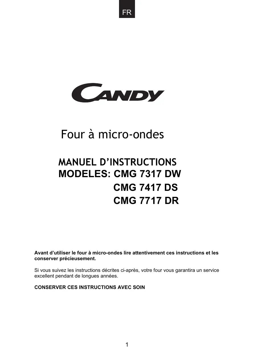 MANUEL D’INSTRUCTIONS MODELES: CMG 7317 DW CMG 7417 DS CMG 7717 DR Avant d’utiliser le four à micro-ondes lire attentivement ces instructions et les conserver précieusement. Si vous suivez les instructions décrites ci-après, votre four vous garantira un service excellent pendant de longues années. CONSERVER CES INSTRUCTIONS AVEC SOIN