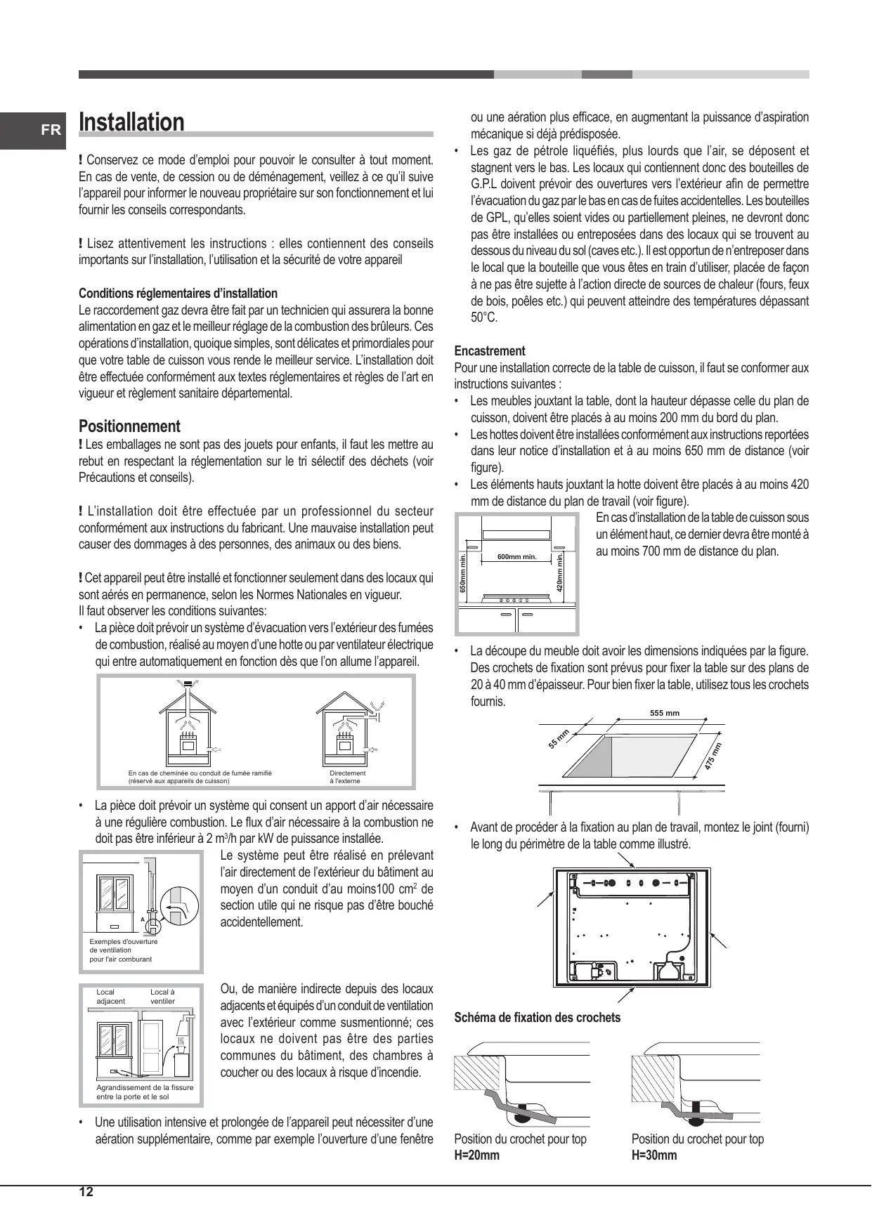 ou une aération plus efficace, en augmentant la puissance d’aspiration mécanique si déjà prédisposée. • Les gaz de pétrole liquéfiés, plus lourds que l’air, se déposent et stagnent vers le bas. Les locaux qui contiennent donc des bouteilles de G.P.L doivent prévoir des ouvertures vers l’extérieur afin de permettre l’évacuation du gaz par le bas en cas de fuites accidentelles. Les bouteilles de GPL, qu’elles soient vides ou partiellement pleines, ne devront donc pas être installées ou entreposées dans des locaux qui se trouvent au dessous du niveau du sol (caves etc.). Il est opportun de n’entreposer dans le local que la bouteille que vous êtes en train d’utiliser, placée de façon à ne pas être sujette à l’action directe de sources de chaleur (fours, feux de bois, poêles etc.) qui peuvent atteindre des températures dépassant 50°C. Encastrement Pour une installation correcte de la table de cuisson, il faut se conformer aux instructions suivantes : • Les meubles jouxtant la table, dont la hauteur dépasse celle du plan de cuisson, doivent être placés à au moins 200 mm du bord du plan. • Les hottes doivent être installées conformément aux instructions reportées dans leur notice d’installation et à au moins 650 mm de distance (voir figure). • Les éléments hauts jouxtant la hotte doivent être placés à au moins 420 mm de distance du plan de travail (voir figure). En cas d’installation de la table de cuisson sous un élément haut, ce dernier devra être monté à au moins 700 mm de distance du plan. 600mm min. 420mm min.