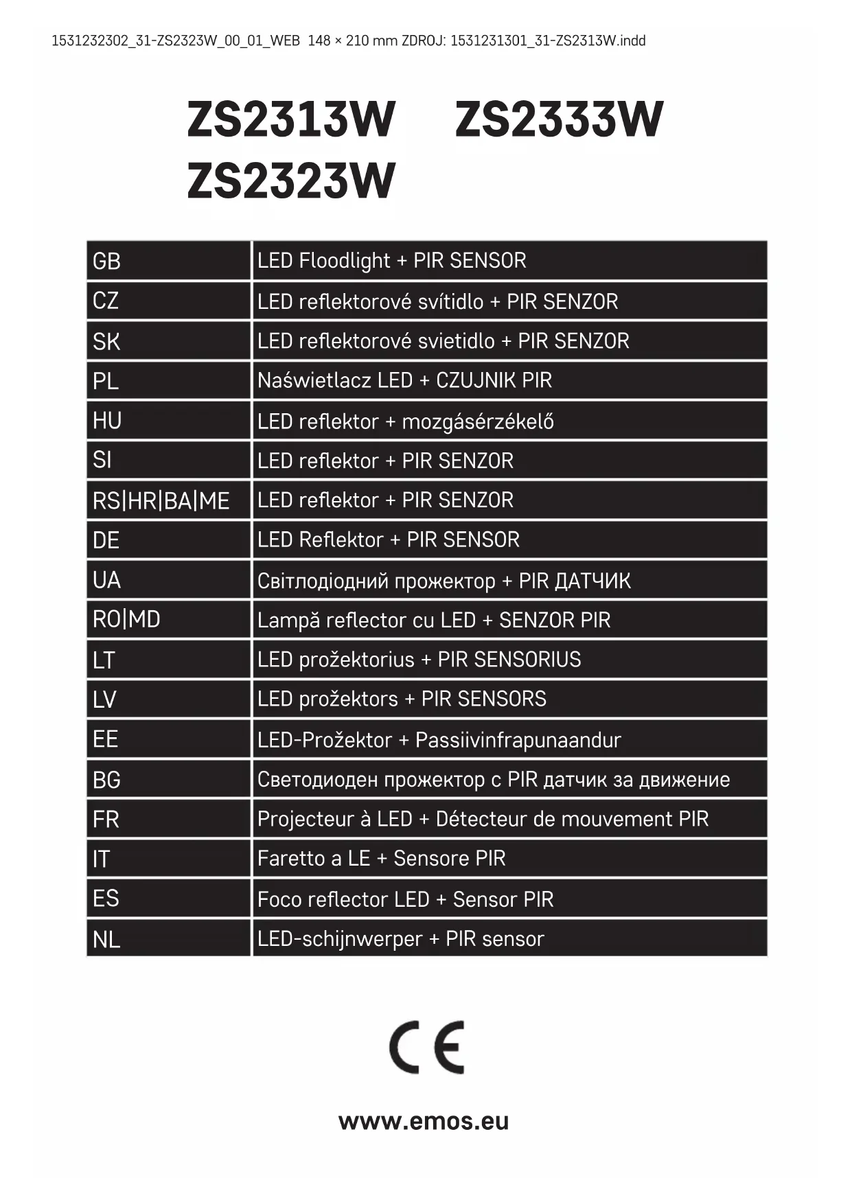 EMOS spol. sr.o. декларира, че ZS2313W, ZS2323W, ZS2333W отговаря на основните изисквания и други раз- поредби на Директива. Оборудването може да се използва свободно в рамките на ЕС. Декларацията за съответствие е част от това ръководство и може да бъде намерена също на уебсайта http://www.emos.eu/download. FR | Projecteur à LED+ Détecteur de mouvement PIR Ce projecteur à LED a été conçu pour être installé sur un support ferme et ce, aussi bien à l'intérieur qu'à l'extérieur. Indice de protection : IP44 – environnement extérieur Détecteur de mouvement PIR – paramètres : Durée d'enclenchement : min. 10 s ±5 s – max. 7min±1min Angle de détection : 120° Sensibilité à la lumière : 10 lux -> 2 000 lux (peut être réglé) Portée de la détection : max. 8 m Vitesse de détection : 0,6–1,5 m/s Réglages du détecteur de mouvement PIR : L'espace surveillé peut être réglé à l'aide de mouvements vers la droite et vers la gauche. Portée de la détection Distance à laquelle le capteur est capable de réagir à un mouvement. Cette distance se règle à l'aide du bouton A – SENS (voir la Fig. 4). Durée d'enclenchement Période durant laquelle la lampe sera allumée par exemple. Cette période se règle à l'aide du bouton B – TIME (voir la Fig. 4). Réglage de la sensibilité à la lumière Réglage de l'intensité de la lumière à laquelle le capteur doit s'enclencher. Cette intensité se règle à l'aide du bouton C – LUX (voir la Fig. 4). Installation Fixer solidement le projecteur sur un support fixe, par exemple sur un mur – voir les gures 1, 2, 3. Hauteur de montage : 1,8–2,5 m. Raccorder le câble d'alimentation destiné au raccordement à un réseau d'alimentation de 220–240 V~. Au moment du montage du projecteur, le câble de raccordement ne peut pas être raccordé au réseau d'alimentation. Le raccordement du câble d'alimentation au projecteur est une opération qui ne pourra être conée qu'à une personne ayant les qualication et les habilitations nécessaires. Diriger la lumière du projecteur comme indiqué sur les gures 1, 2. L – brun – câble de phase (live) G – jaune-vert – câble de mise à la terre (ground) N – bleu – neutre (neutral) Consignes de maintenance : Avant de réaliser la maintenance, éteindre le projecteur et attendre qu'il refroidisse. Pour le nettoyage, utiliser un chion doux humide. Ne jamais immerger le projecteur dans de l'eau ou dans d'autres liquides. Durant la maintenance, respecter les règles générales de la sécurité du travail et être particulièrement prudent. AVERTISSEMENTS