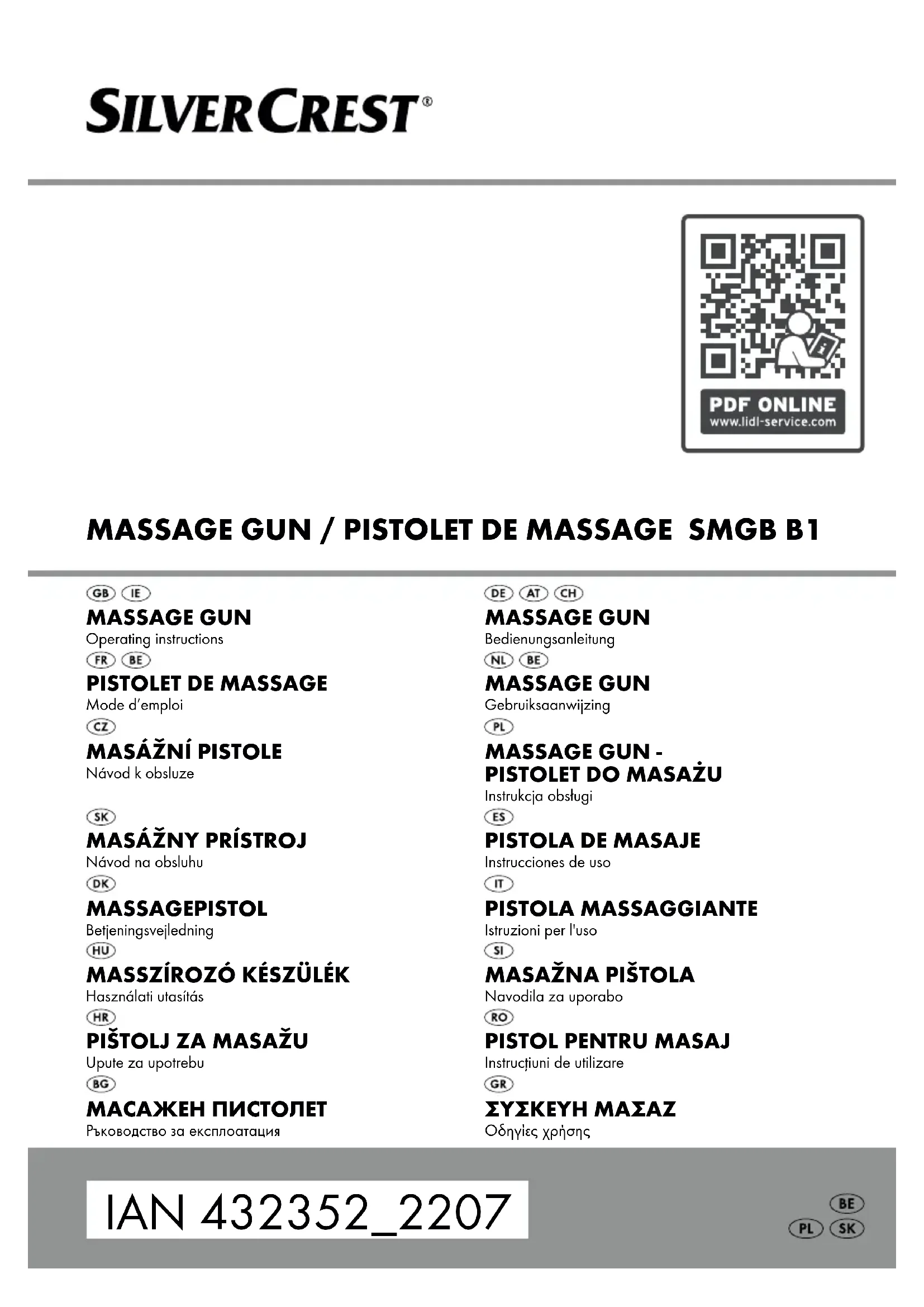 Article 1648 1er alinéa du Code civil L‘action résultant des vices rédhibitoires doit être intentée par l‘acquéreur dans un délai de deux ans à compter de la découverte du vice. Les pièces détachées indispensables à l’utilisation du produit sont disponibles pendant la durée de la garantie du produit. Procédure en cas de garantie Afin de garantir un traitement rapide de votre demande, veuillez suivre les indica- tions suivantes : ■ Veuillez avoir à portée de main pour toutes questions le ticket de caisse et la référence article (IAN)432352_2207 en tant que justificatif de votre achat. ■ Vous trouverez la référence sur la plaque signalétique sur le produit, une gravure sur le produit, sur la page de garde du mode d’emploi (en bas à gauche) ou sur l’autocollant au dos ou sur le dessous du produit. ■ Si des erreurs de fonctionnement ou d’autres vices venaient à apparaître, veuillez d’abord contacter le département service clientèle cité ci-dessous par téléphone ou par e-mail. ■ Vous pouvez ensuite retourner un produit enregistré comme étant défectueux en joignant le ticket de caisse et en indiquant en quoi consiste le vice et quand il est survenu, sans devoir l’affranchir à l’adresse de service après- vente communiquée. Sur www.lidl-service.com, vous pourrez télécharger ce mode d’emploi et de nombreux autres manuels, vidéos produit et logiciels d’installation. Grâce à ce code QR, vous arriverez directement sur le site Lidl service après- vente (www.lidl-service.com) et vous pourrez ouvrir votre mode d’emploi en saisissant votre référence (IAN)432352_2207. Garantie pour Kompernass Handels GmbH pour la Belgique Chère cliente, cher client, Cet appareil est garanti 3 ans à partir de la date d’achat. Si ce produit venait à présenter des vices, vous disposez de droits légaux face au vendeur de ce produit. Vos droits légaux ne sont pas restreints par notre garantie présentée ci-dessous. Conditions de garantie La période de garantie débute à la date d’achat. Veuillez bien conserver le ticket de caisse. Celui-ci servira de preuve d’achat. Si dans un délai de trois ans suivant la date d’achat de ce produit, un vice de matériel ou de fabrication venait à apparaître, le produit sera réparé, remplacé gratuitement par nos soins ou le prix d’achat remboursé, selon notre choix.SMGB B1 FR