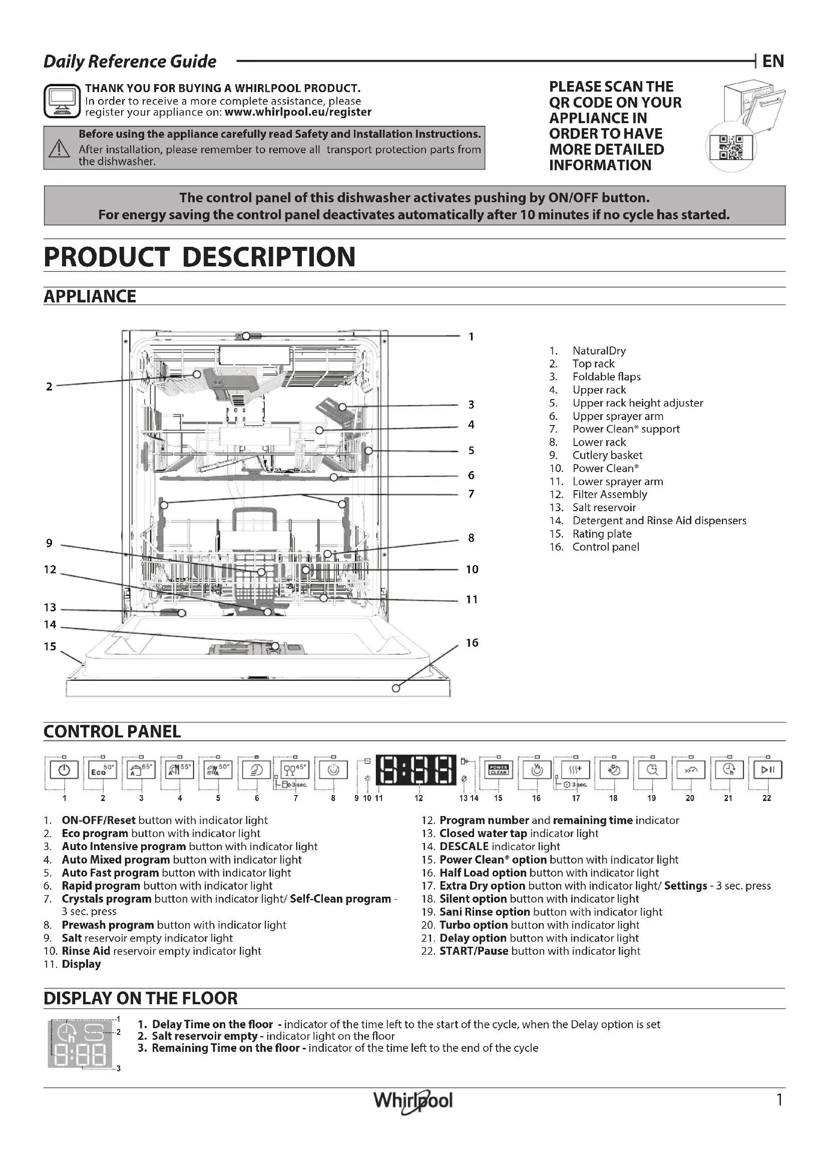 Guide D’utilisation Quotidienne MERCI D’AVOIR CHOISI UN PRODUIT WHIRLPOOL. Afin de recevoir une assistance plus complète, merci d’enregis-trer votre appareil sur: www.whirlpool.eu/register1. Touche et voyant MARCHE-ARRÊT/Réinitialisation2. Touche et voyant de programme Éco3. Touche et voyant de programme Intensif Auto4. Touche et voyant de programme Mixte Auto5. Touche et voyant de programme Rapide Auto6. Touche et voyant de programme Rapide7. Touche et voyant de programme Cristal / Programme Autonettoyant - pression de 3 secondes8. Touche et voyant de programme Prélavage9. Témoin de réservoir de sel vide10. Témoin de réservoir de liquide de rinçage vide11. Écran12. Indicateur de numéro de programme et de temps restant13. Voyant Robinet d’eau fermé14. Témoin DÉTARTRAGE15. Touche et voyant de l’option Power Clean®16. Touche et voyant d’option Demi-charge17. Touche et voyant d’option Extra Sec/Réglages - pression de 3 secondes18. Touche et voyant d’option Silencieux 19. Touche et voyant d’option Rinçage Antibactérien20. Touche et voyant d’option Turbo 21. Touche et voyant d’option Départ Diéré22. Touche et voyant DÉPART/Pause