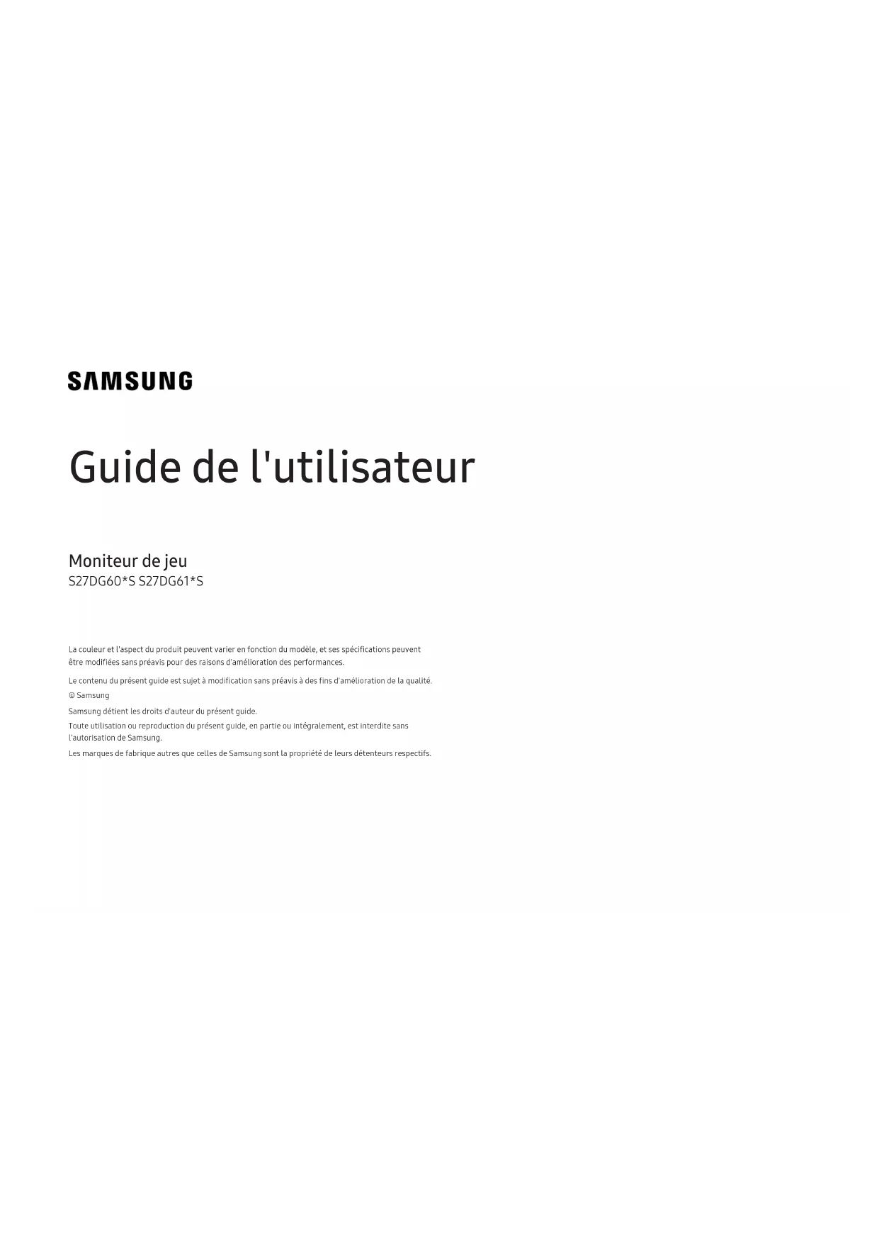 Guide de l'utilisateur Moniteur de jeu S27DG60*S S27DG61*S La couleur et l'aspect du produit peuvent varier en fonction du modèle, et ses spécifications peuvent être modifiées sans préavis pour des raisons d'amélioration des performances. Le contenu du présent guide est sujet à modification sans préavis à des fins d'amélioration de la qualité. © Samsung Samsung détient les droits d'auteur du présent guide. Toute utilisation ou reproduction du présent guide, en partie ou intégralement, est interdite sans l'autorisation de Samsung. Les marques de fabrique autres que celles de Samsung sont la propriété de leurs détenteurs respectifs.Table des matières Avant utilisation du produit Consignes de sécurité 4 Électricité et sécurité 4 Installation 5 Fonctionnement 6 Nettoyage 8 Position correcte lors de l'utilisation du produit 8 Préparatifs Installation 9 Fixation du socle 9 Précautions lors du déplacement du produit 10 Vérification de l'espace autour du produit 11 Ajustement de l'inclinaison et de la hauteur du produit 11 Rotation du produit 13 Spécifications du kit de montage mural (VESA) 14 Panneau de configuration 15