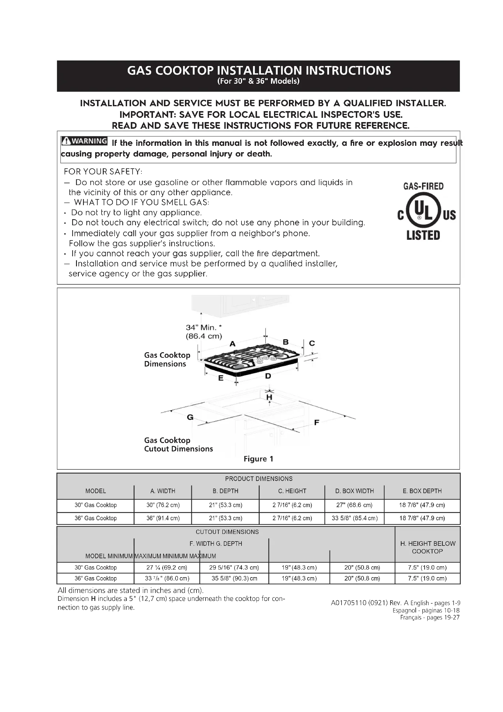 Table de cuisson au gaz de 30 po (76,2 cm)69,2 cm (27 1/4 po) 74,3 cm (29 5/16 po) 48,3 cm (19 po) 50,8 cm (20 po) 19,0 cm (7,5 po)Table de cuisson au gaz de 36 po (91,4 cm)86,0 cm (33 7/8 po) 90,3 cm (35 5/8 po) 48,3 cm (19 po) 50,8 cm (20 po) 19,0 cm (7,5 po)DIMENSIONS DU PRODUIT MODÈLE A. LARGEUR B. PROFONDEUR C. HAUTEUR D. LARGEUR DE LA BOÎTEE. LARGEUR DE LA BOÎTETable de cuisson au gaz de 30 po (76,2 cm) 76,2 cm (30 po) 53,3 cm (21 po) 61,6 cm (24 1/4 po) 68,6 cm (27 po) 47,9 cm (18 7/8 po) Table de cuisson au gaz de 36 po (91,4 cm) 91,4 cm (36 po) 53,3 cm (21 po) 61,6 cm (24 1/4 po) 85,4 cm (33 5/8 po) 47,9 cm (18 7/8 po) Si l'information contenue dans ce guide n'est pas suivie à la lettre, il pourra en résulter un feu ou une explosion entraînant des dommages matériels, des blessures ou même la mort. 86,4 cm (34 po) minimumINSTRUCTIONS D'INSTALLATION POUR TABLE DE CUISSON AU GAZ Modèles de 30 po (76,2 cm) et 36 po (91,4 cm)