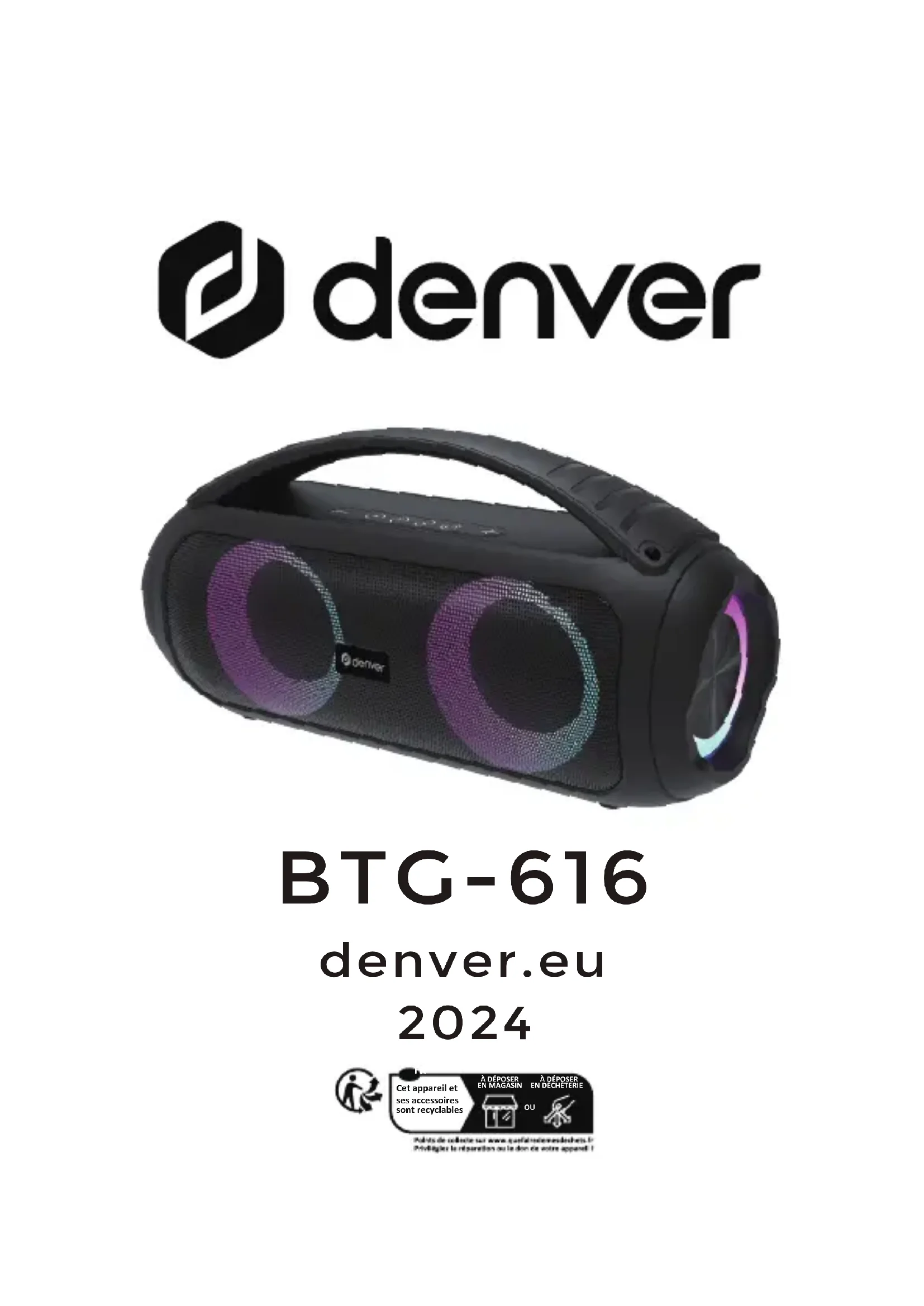 FRA 6recyclées conformément à la réglementation, vous contribuez à préserver l’environnement. Toutes les municipalités disposent de points de collecte dans lesquels les appareils électriques et électroniques ainsi que les piles et batteries peuvent être déposés sans frais en vue de leur recyclage, ou offrent des services de ramassage des déchets. Vous pouvez obtenir des informations supplémentaires auprès des services de votre municipalité. Par la présente, BTG-616 est conforme à la directive 2014/53/EU. Denver A/S déclare que l'équipement radioélectrique du type Le texte intégral de la déclaration de conformité UE est disponible à l’adresse Internet suivante: denver.eu, et cliquez sur l’icône de recherche située en haut de la page. Numéro de modèle: BTG-616. Entrez dans la page produit, la directive RED se trouve dans Téléchargements/Autres téléchargements. Plage de fréquence de fonctionnement: 20HZ-20KHZ Puissance de sortie maximale: 10W*2 Fréquence Bluetooth : 2402MHZ-2480MHZ