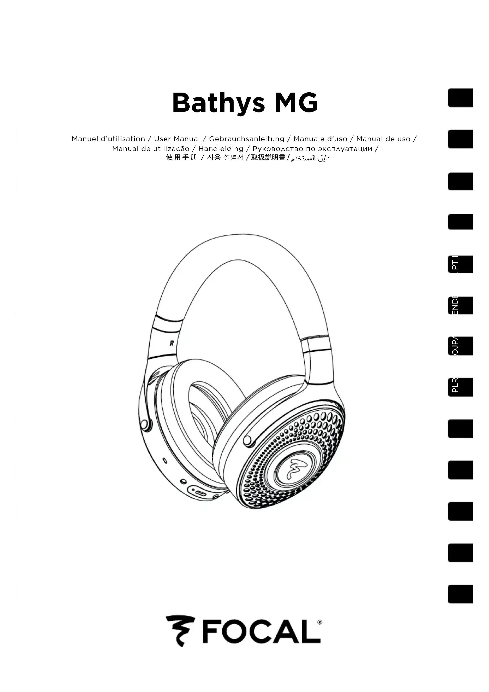 Bathys MG Manuel d’utilisation / User manual Bathys MG Type Casque fermé, actif, réduction de bruit Bluetooth® 5.2 Multipoint ; portée > 15 m Bande de fréquence Bluetooth® 2402 - 2480 Mhz Puissance maximale d’émission 4,56 dBm (2,86 mW) Codecs audio SBC, AAC, aptX™, aptX™ Adaptive Autonomie 30h Bluetooth® Noise Cancelling 35h mode jack 42h mode USB DAC Autres fonctionnalités Google Fast Pair Haut-parleurs 40 mm Magnésium Réponse en fréquence 10 Hz to 22 kHz Taux de distorsion harmonique <0,2 % @ 1 kHz Type de batterie Lithium-ion 1060 mAH Alimentation 5 V-2000 mA (non fournie) Microphones 8 Application de contrôle Focal & Naim, compatible iOS et Android Poids 350 g Câbles et connecteurs 1,2 m Jack 3,5 mm 1,2 m USB Type-C® Mallette de transport 24 x 21 x 7 cm3 Bathys MG Manuel d’utilisation / User manual Bathys MG Type Closed-back headphones, active, noise cancelling Bluetooth® 5.2 Multipoint ; range > 15m Bluetooth® frequency band 2402 - 2480Mhz Maximum emission power 4.56dBm (2.86mW) Audio codecs SBC, AAC, aptX™, aptX™ Adaptive Autonomy 30h Bluetooth® Noise Cancelling 35h mode jack 42h mode USB DAC Other functions Google Fast Pair Drivers 40mm Magnesium Frequency response 10Hz to 22kHz Harmonic distortion rate <0.2% @1kHz Battery type Lithium-ion 1060mAH Power supply 5V-2000mA (Not supplied) Microphones 8 Control application Focal & Naim, iOS and Android compatible Weight 350g Cables and connectors 1.2m 3.5mm Jack 1.2m USB Type-C® Carrying case 9.5x8.3x2.8" (24x21x7cm)FR À LIRE EN PREMIER ! INSTRUCTIONS DE SÉCURITÉ IMPORTANTES ! Français Symbole de mise en garde. Ce symbole est destiné à prévenir l’utilisateur de la présence d’instructions importantes mentionnées dans le manuel d’utilisation et relatives à la manipulation, la mise en œuvre et à l’entretien de l’appareil. Avant toute utilisation du produit, lire les instructions et les conserver avec précaution pour vous y référer ultérieurement si nécessaire.