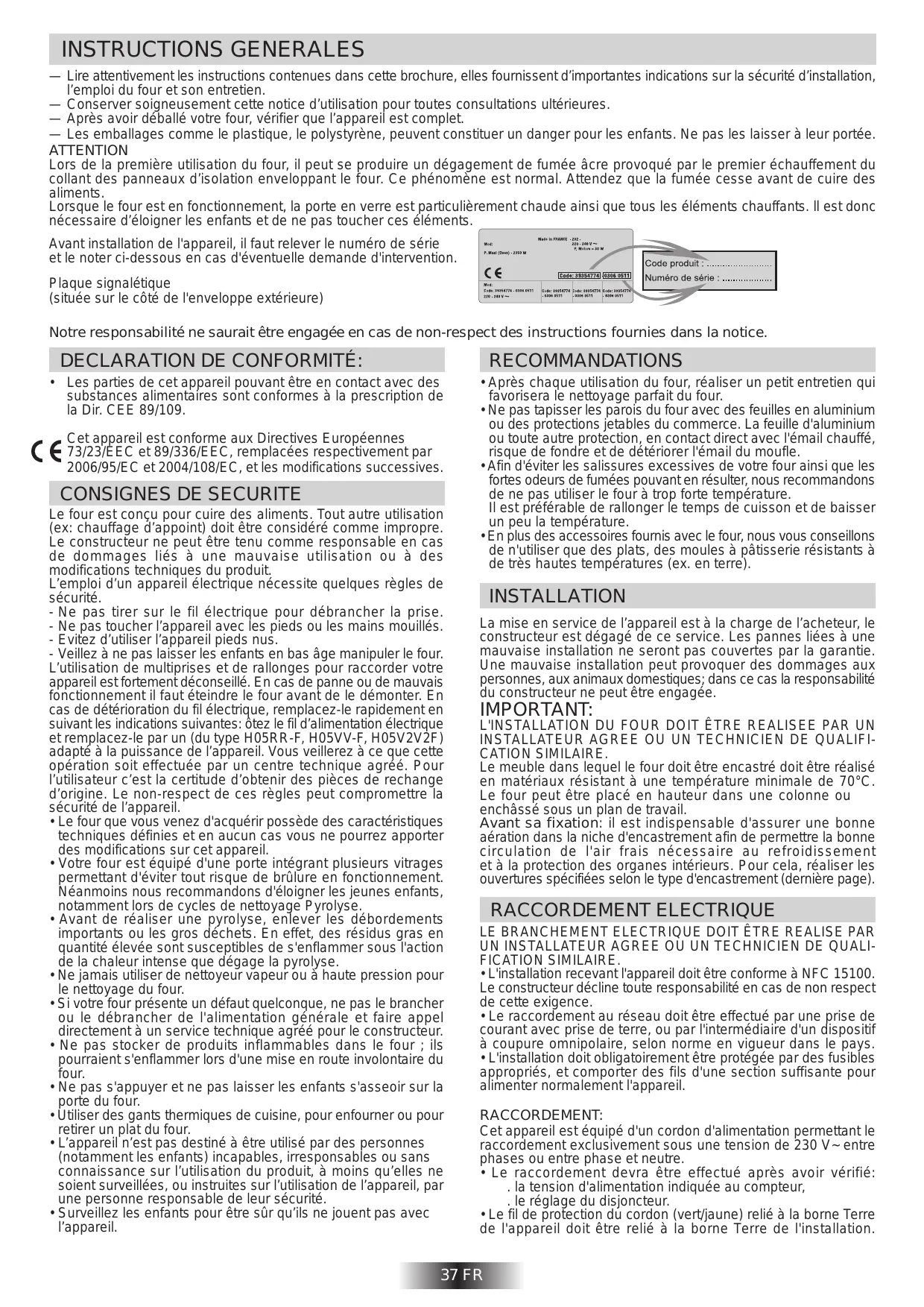 - Betriebsart "Umluft mit Unterhitze"; damit Sie Zeit sparen können, empfehlen wir das Vorwärmen mit Betriebsart "Oberhitze / Unterhitze". 36 DE INSTRUCTIONS GENERALES — Lire attentivement les instructions contenues dans cette brochure, elles fournissent d’importantes indications sur la sécurité d’installation, l’emploi du four et son entretien. — Conserver soigneusement cette notice d’utilisation pour toutes consultations ultérieures. — Après avoir déballé votre four, vérifier que l’appareil est complet. — Les emballages comme le plastique, le polystyrène, peuvent constituer un danger pour les enfants. Ne pas les laisser à leur portée. ATTENTION Lors de la première utilisation du four, il peut se produire un dégagement de fumée âcre provoqué par le premier échauffement du collant des panneaux d’isolation enveloppant le four. Ce phénomène est normal. Attendez que la fumée cesse avant de cuire des aliments. Lorsque le four est en fonctionnement, la porte en verre est particulièrement chaude ainsi que tous les éléments chauffants. ll est donc nécessaire d’éloigner les enfants et de ne pas toucher ces éléments. Avant installation de l'appareil, il faut relever le numéro de série et le noter ci-dessous en cas d'éventuelle demande d'intervention. Plaque signalétique (située sur le côté de l'enveloppe extérieure) Notre responsabilité ne saurait être engagée en cas de non-respect des instructions fournies dans la notice. DECLARATION DE CONFORMITÉ: RECOMMANDATIONS