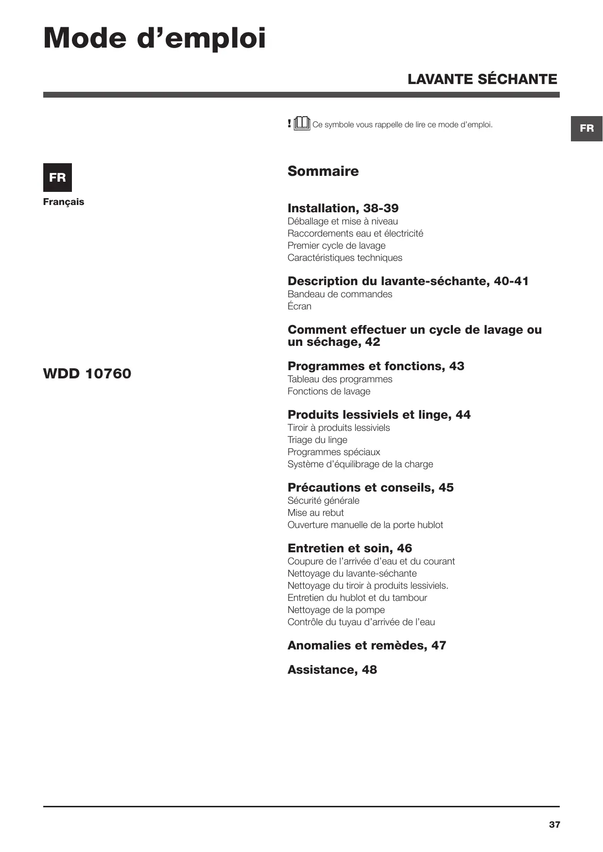 FR Sommaire Installation, 38-39 Déballage et mise à niveau Raccordements eau et électricité Premier cycle de lavage Caractéristiques techniques