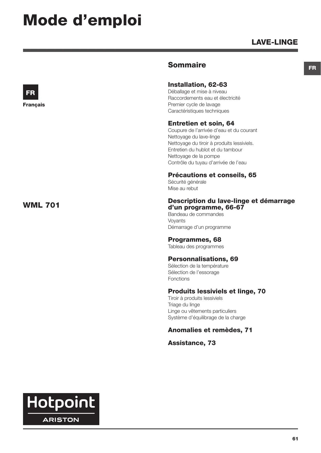 Retrouvez gratuitement la notice de l'appareil WML 701 EU.M HOTPOINT au format PDF.