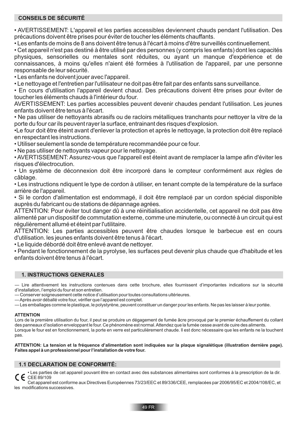- Les parties de cet appareil pouvant être en contact avec des substances alimentaires sont conformes à la prescription de la dir. CEE 89/109 Cet appareil est conforme aux Directives Européennes 73/23/EEC et 89/336/CEE, remplacées par 2006/95/EC et 2004/108/EC, et les modifications successives. 49 FR Cet appareil est conçu pour cuire des aliments. Tout autre utilisation (exemple chauffage d’appoint) doit être considéré comme impropre. Le constructeur ne peut être tenu comme responsable en cas de dommages liés à une mauvaise utilisation ou a des modifications techniques du produit. L’emploi d’un appareil électrique nécessite quelques règles de sécurité. - Ne pas tirer sur le fil électrique pour débrancher la prise. -Ne pas toucher l’appareil avec les pieds ou les mains mouillés. -Evitez d’utiliser l’appareil pieds nus. L’utilisation de multiprises et de rallonges pour raccorder votre appareil est fortement déconseillé. En cas de panne ou de mauvais fonctionnement il faut éteindre le four avant de le démonter. En cas de détérioration du fil électrique, remplacez-le rapidement en suivant les indications suivantes: ôtez le fil d’alimentation électrique et remplacez-le par un (du type H05RR-F, H05VV-F, H05V2V2F) adapté à la puissance de l’appareil. Vous veillerez à ce que cette opération soit effectuée par un centre technique agréé. Pour l’utilisateur c’est la certitude d’obtenir des pièces de rechange d’origine. Le non-respect de ces règles peut compromettre la sécurité de l’appareil. Une fois installé le fil d’alimentation doit être positionné de manière a ce que sa température ne dépasse pas de 50°C la température ambiante. L’appareil est conforme aux exigences de sécurité prévues par les organismes qui établissent les normes. La sécurité électrique de cet appareil n’est assurée que si il est correctement installé tout en respectant les normes de sécurité électrique en vigueur. Le constructeur ne peut être tenu comme responsable des dommages résultant du manque de mise à la terre de l’installation.