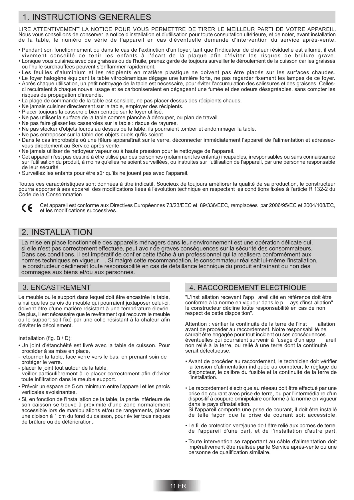 - Si, en fonction de l'installation de la table, la partie inférieure de son caisson se trouve à proximité d'une zone normalement accessible lors de manipulations et/ou de rangements, placer une cloison à 1 cm du fond du caisson, pour éviter tous risques de brûlure ou de détérioration. "L'inst allation recevant l'app areil cité en référence doit être conforme à la norme en vigueur dans le p ays d'inst allation". le constructeur décline toute responsabilité en cas de non respect de cette disposition". Attention : vérifier la continuité de la terre de l'inst allation avant de procéder au raccordement. Notre responsabilité ne saurait être engagée pour tout incident ou ses conséquences éventuelles qui pourraient survenir à l'usage d'un app areil non relié à la terre, ou relié à une terre dont la continuité serait défectueuse.