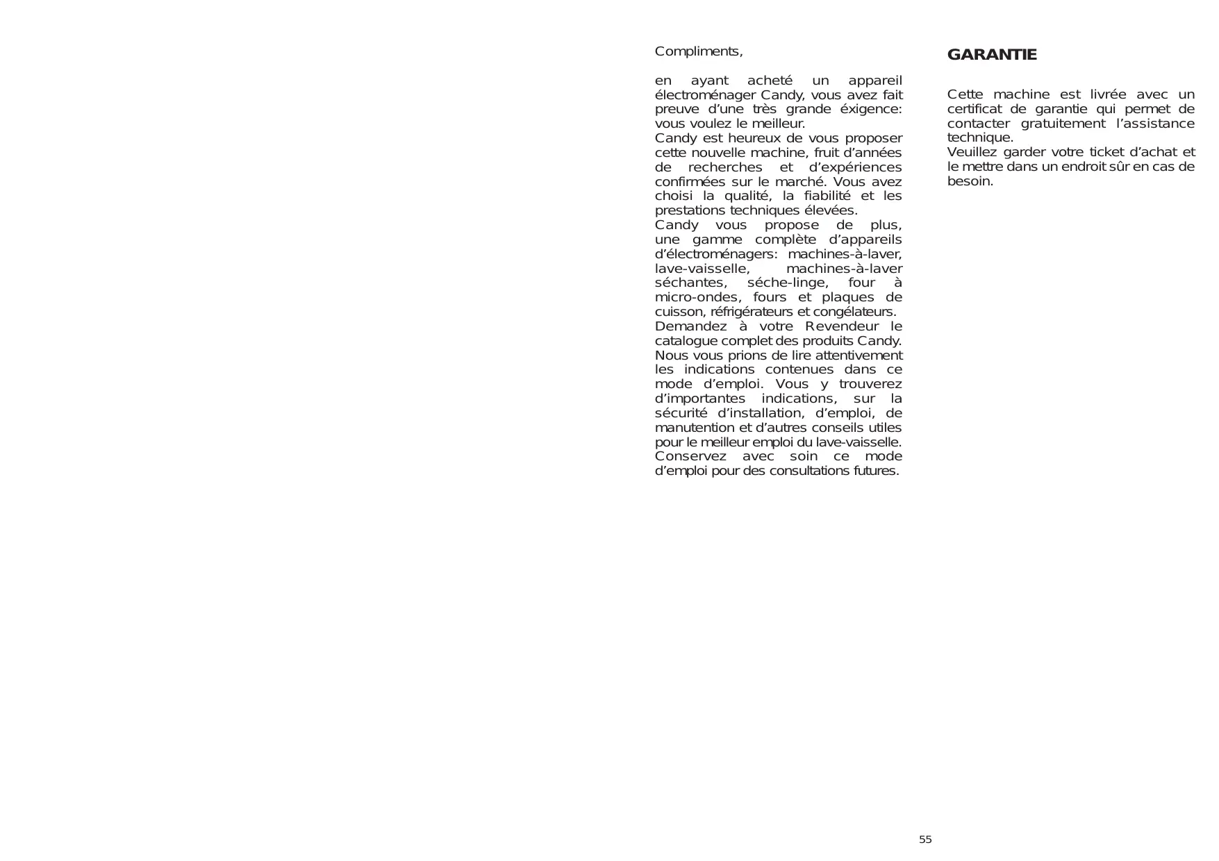 Compliments, GARANTIE en ayant acheté un appareil électroménager Candy, vous avez fait preuve d’une très grande éxigence: vous voulez le meilleur. Candy est heureux de vous proposer cette nouvelle machine, fruit d’années de recherches et d’expériences confirmées sur le marché. Vous avez choisi la qualité, la fiabilité et les prestations techniques élevées. Candy vous propose de plus, une gamme complète d’appareils d’électroménagers: machines-à-laver, lave-vaisselle, machines-à-laver séchantes, séche-linge, four à micro-ondes, fours et plaques de cuisson, réfrigérateurs et congélateurs. Demandez à votre Revendeur le catalogue complet des produits Candy. Nous vous prions de lire attentivement les indications contenues dans ce mode d’emploi. Vous y trouverez d’importantes indications, sur la sécurité d’installation, d’emploi, de manutention et d’autres conseils utiles pour le meilleur emploi du lave-vaisselle. Conservez avec soin ce mode d’emploi pour des consultations futures. Cette machine est livrée avec un certificat de garantie qui permet de contacter gratuitement l’assistance technique. Veuillez garder votre ticket d’achat et le mettre dans un endroit sûr en cas de besoin.