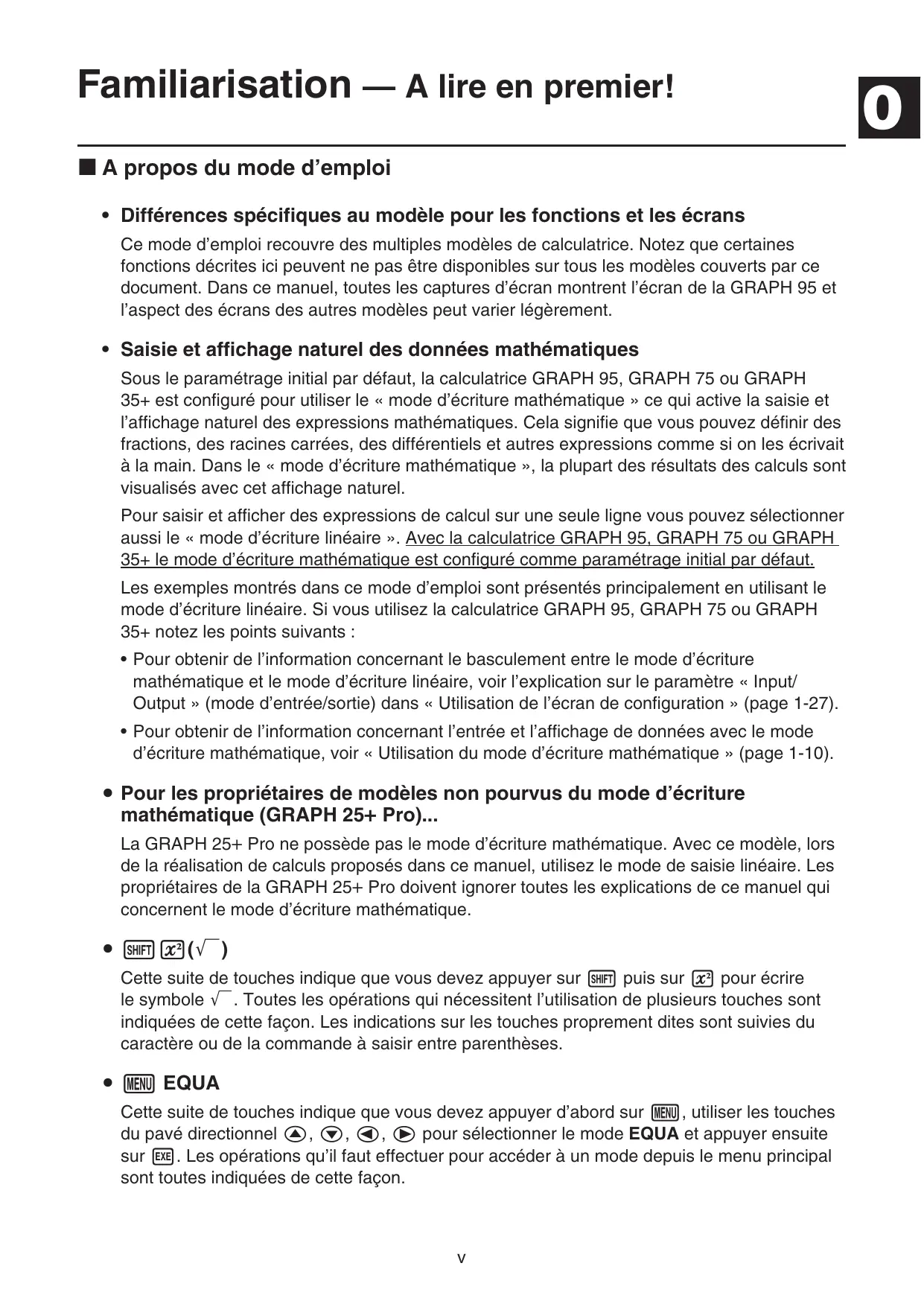 - Pour obtenir de l’information concernant l’entrée et l’affichage de données avec le mode d’écriture mathématique, voir « Utilisation du mode d’écriture mathématique » (page 1-10). S Pour les propriétaires de modèles non pourvus du mode d’écriture mathématique (GRAPH 25+ Pro)... La GRAPH 25+ Pro ne possède pas le mode d’écriture mathématique. Avec ce modèle, lors de la réalisation de calculs proposés dans ce manuel, utilisez le mode de saisie linéaire. Les propriétaires de la GRAPH 25+ Pro doivent ignorer toutes les explications de ce manuel qui concernent le mode d’écriture mathématique.